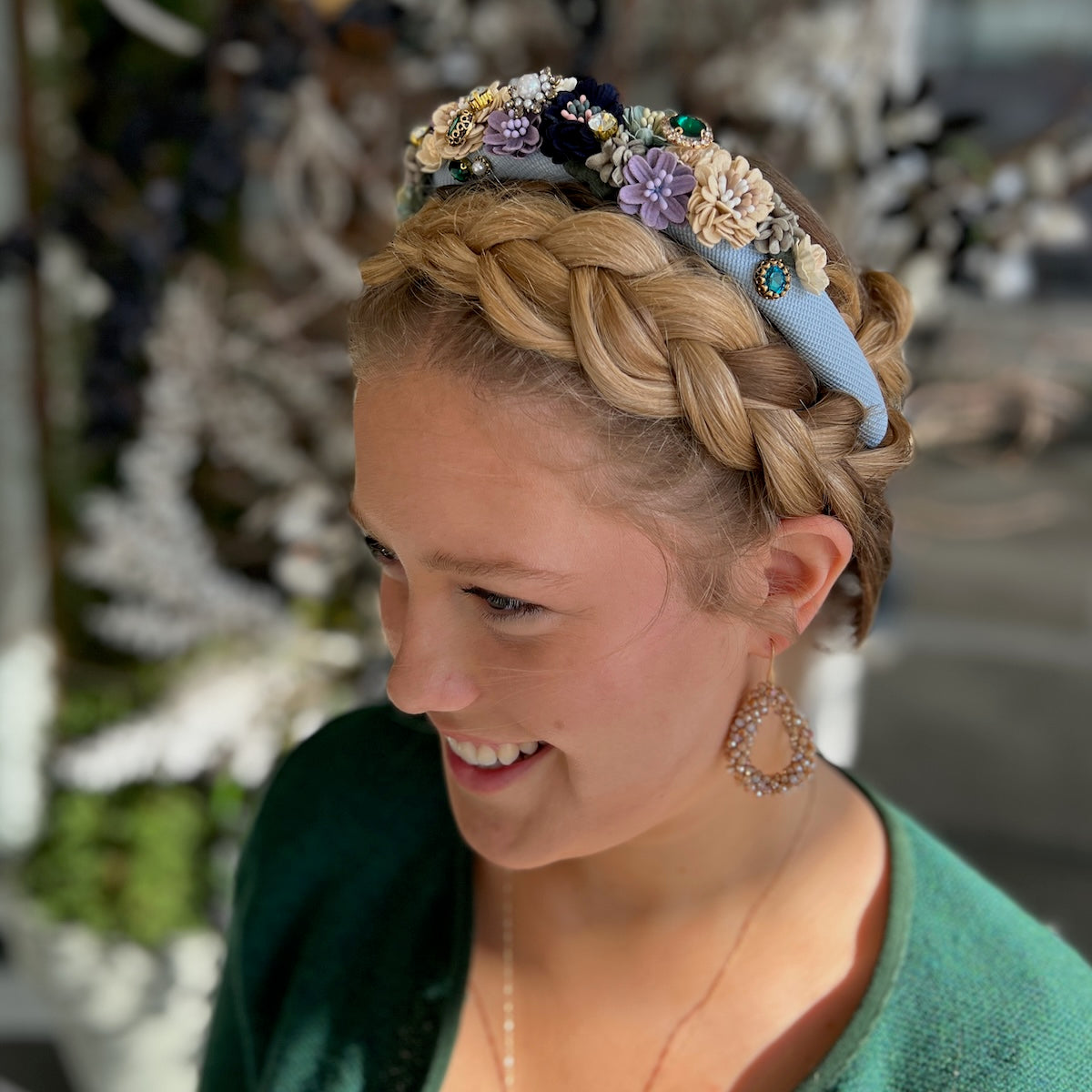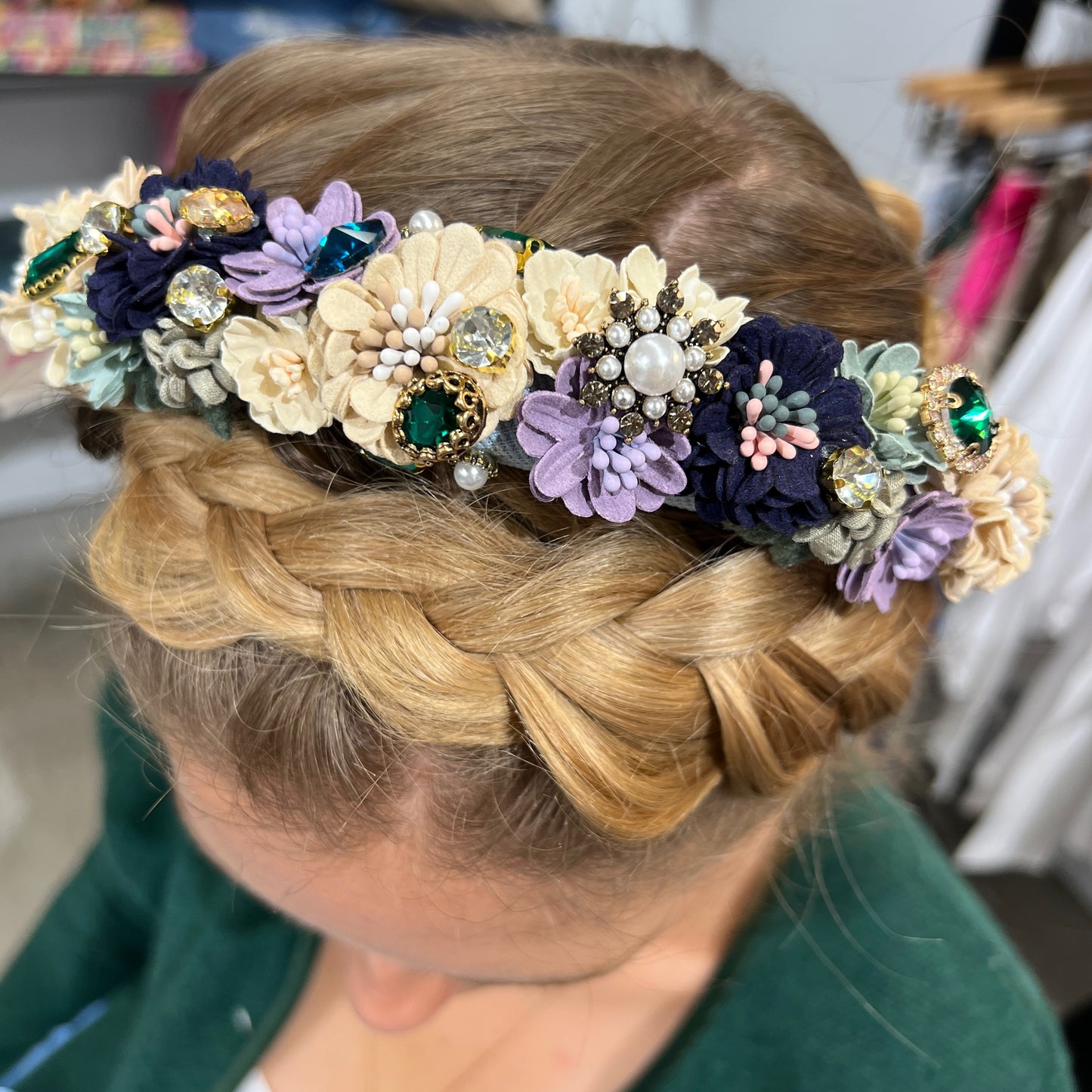Unsere Blumenhaarreifen sind das perfekte Accessoire, um jedem Outfit eine verspielte und feminine Note zu verleihen. Mit viel Liebe zum Detail werden die Haarreifen mit zarten Stoffblüten, Perlen und Bändern verziert. Ob zum Dirndl, Sommerkleid zur Gartenparty oder einfach nur für den Alltag – ein Blumenhaarreifen verleiht jedem Look einen besonderen Charme.
