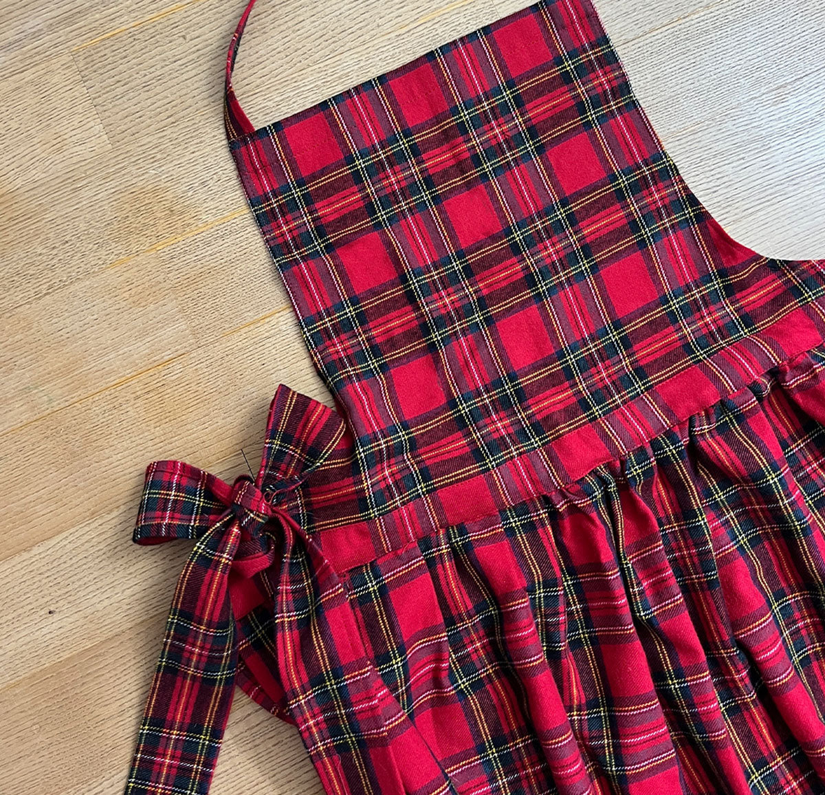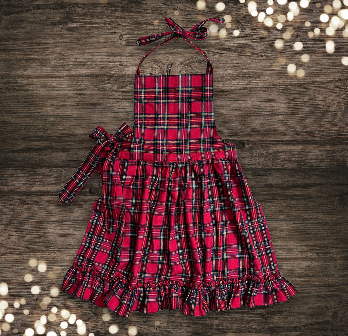 Die liebevoll gearbeitete Rüsche, die verstellbaren Bindebänder und die sorgfältige Verarbeitung machen die Schürze zu einem bezaubernden Accessoire für Plätzchenbacken, Adventssonntage und Familienfeste.