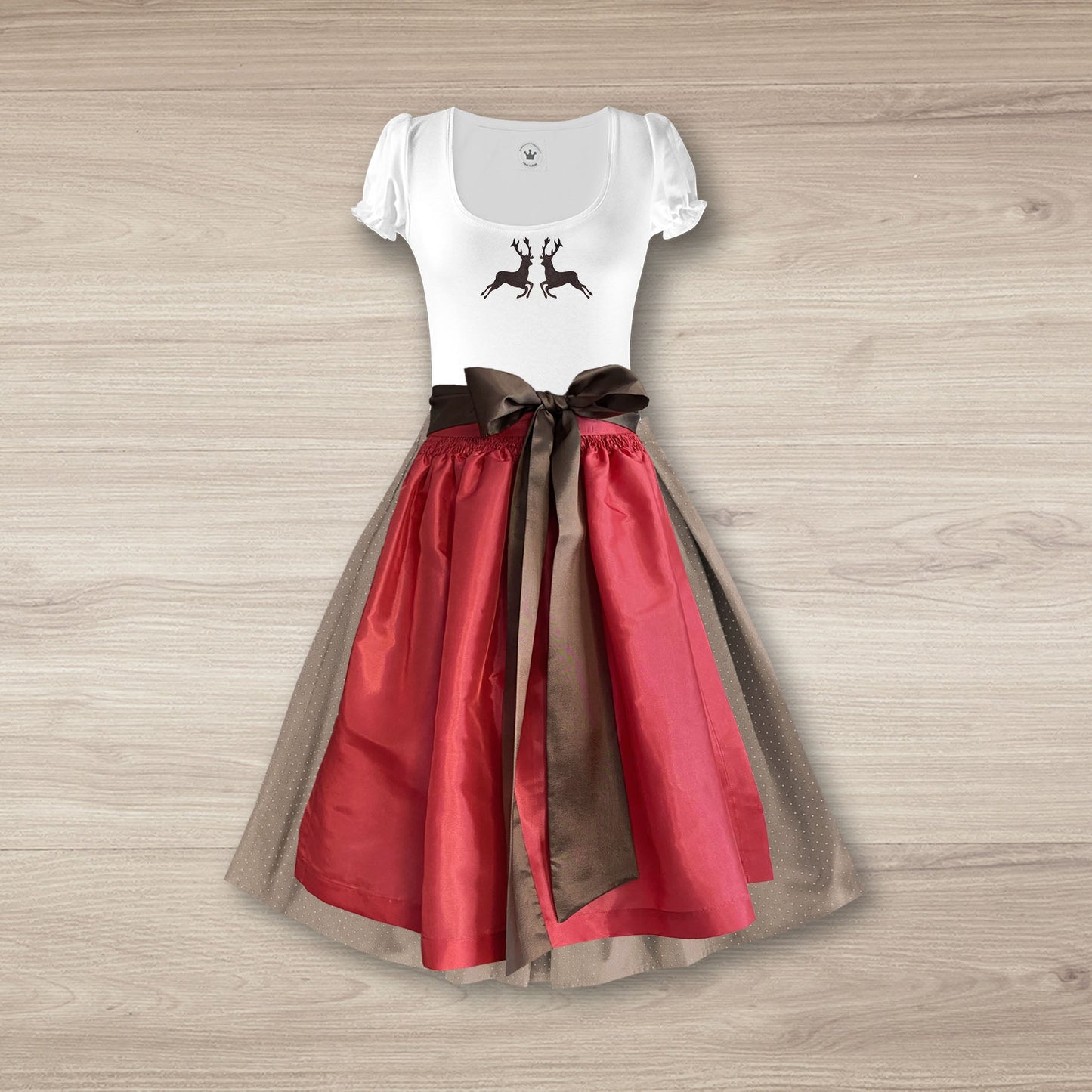 Das Damen Dirndl "Sommernacht" bezaubert mit seinen 2-farbigen Schürzen, Die Taftschürze ist mit Kontrastfarbenen Bändern gearbeitet. Der braune getupfte Rock wird kombiniert mit dem schmalen und gut dekolletierten Dirndl Shirt , diese werden von Hand bedruckt und mit einer zarten Samtschleife verziert. Entscheiden sie bitte, welches Shirt sie gerne dazu kombinieren möchten und teilen es uns unter "Shirtmotiv" mit. Klasssich mit 2 Hirschen aus Samt, romantisch mit 2 farbigem Herz (=Trachtenherz) oder aus Blüten und Blättern (=Blütenherz) oder lieber ausgefallen mit süßen Ballerina als Print/Samt Applikation. Ergänzen lässt sich das Dirndl mit unserem farblich passenden Janker "Katharina" in braun oder dunkelgrün. Ein echter Hingucker ist das Dirndl natürlich im Partnerlook mit Ihrer Tochter!
