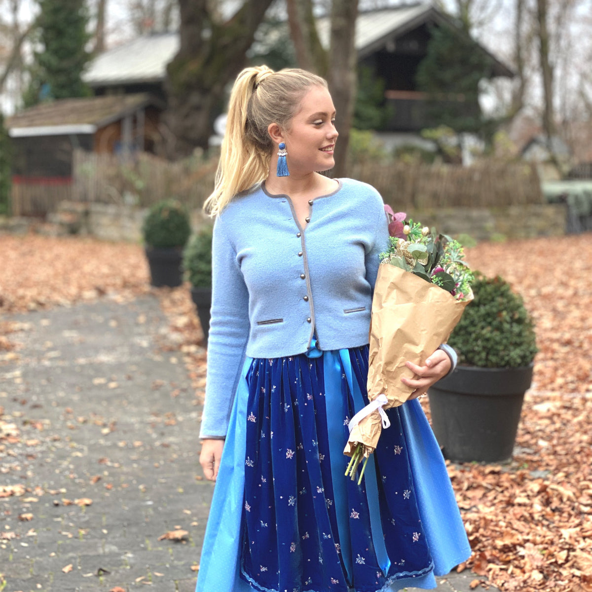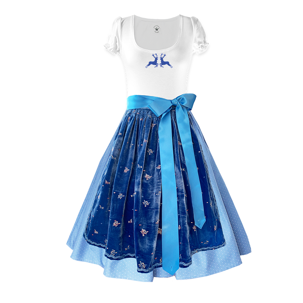 Der süße getupfte Rock wird mit einer edlen aufwendig bestickten Samtschürze in azurblau und einem weißen Dirndl Shirt kombiniert. Unser Damen Dirndl ist eine neue Variante des klassischen Dirndls, jedoch ist es bequem und feminin zugleich. Das Besondere ist die Wandlungsfähigkeit, denn es ist 3-teilig und besteht aus Rock, Schürze und Dirndl Shirt.