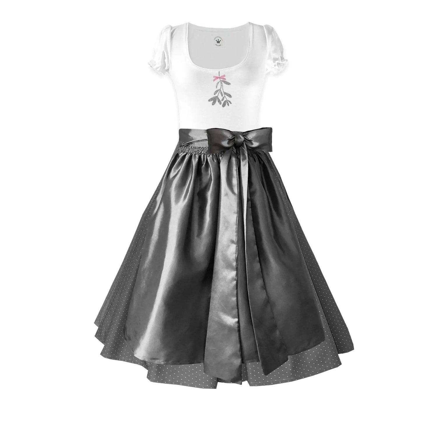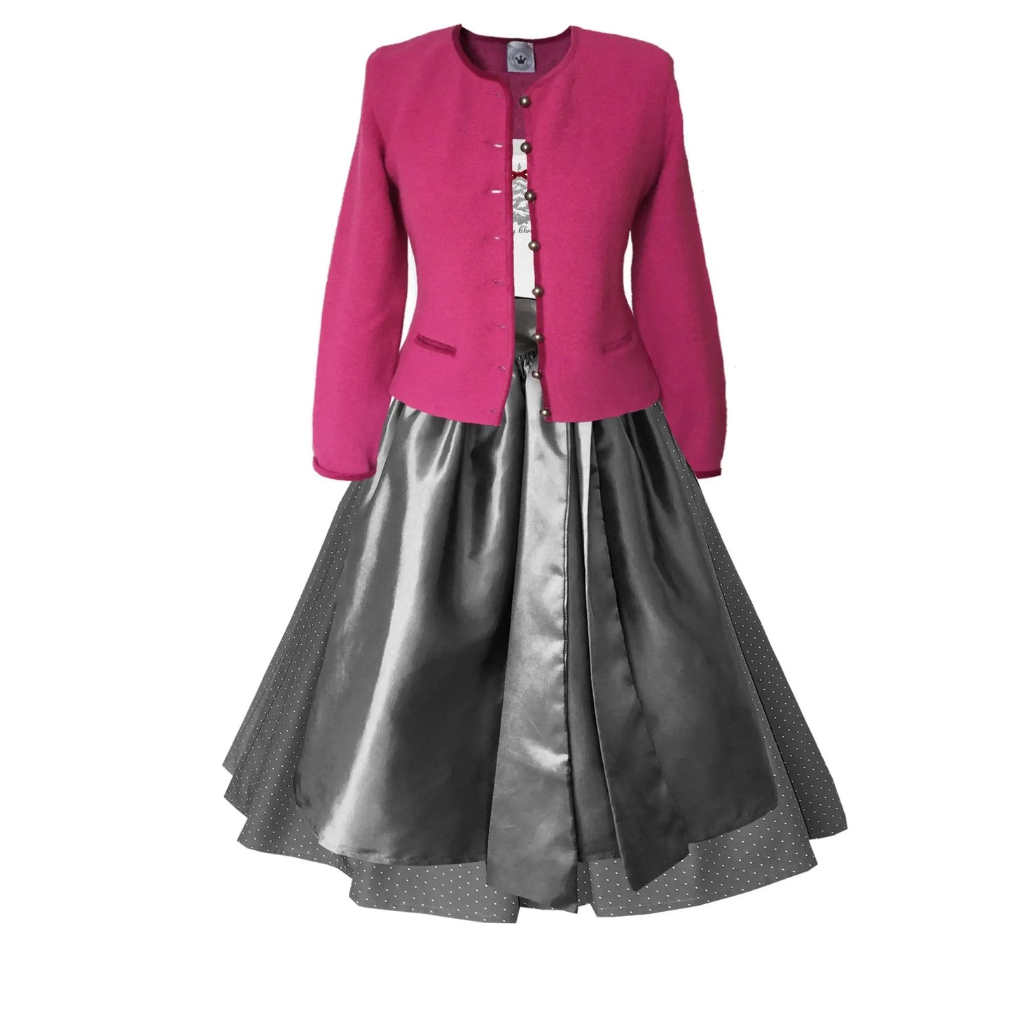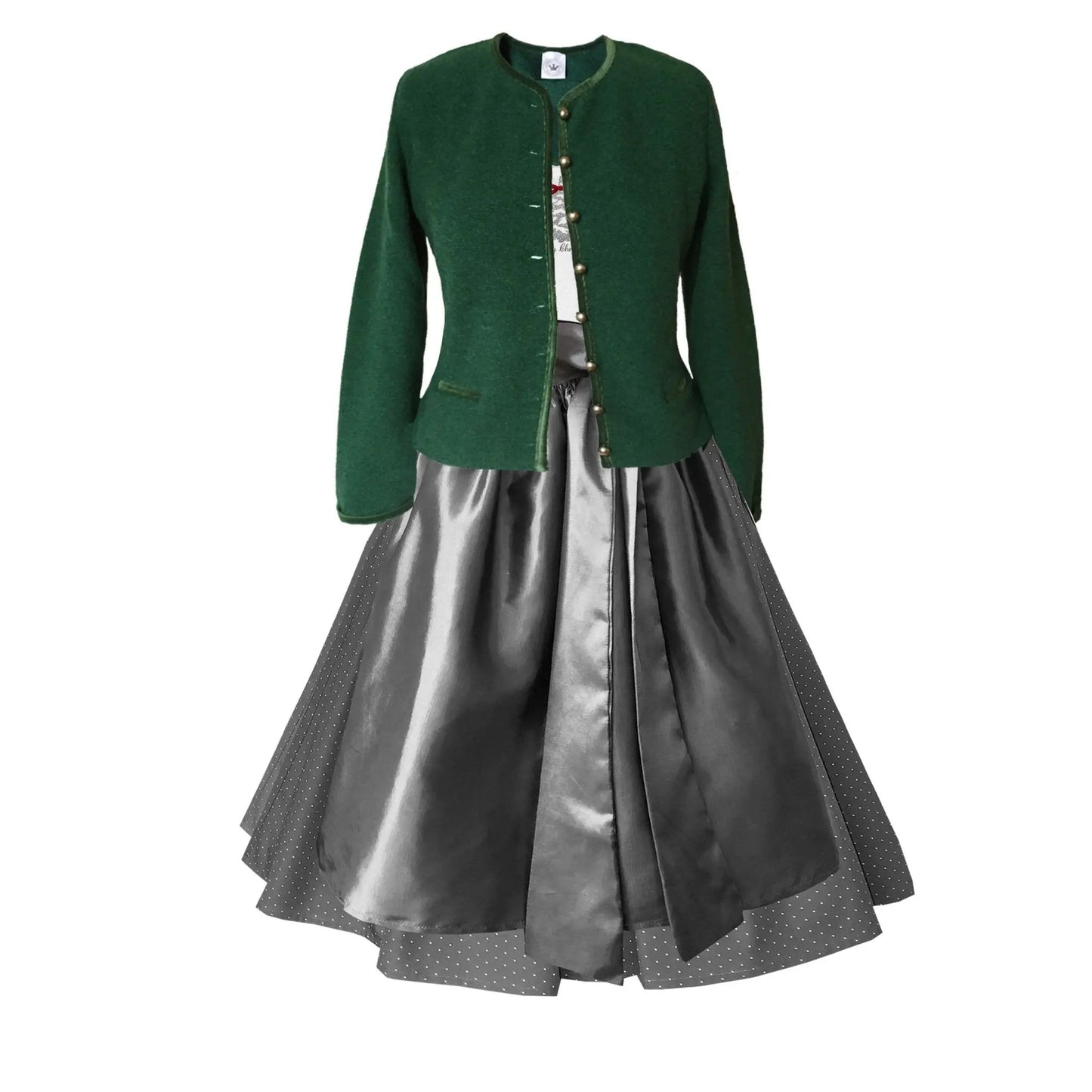 Trendige, coole grau Nuancen, wie silber und Graphit vereint in einem traditionellen Look. Das Festtagsdirndl "Bergkristall" kombiniert einen grauen Tupfenrock mit einer silber schimmernden Uni farbenen Schürze. Ein zauberhaftes Outfit für die Feiertage, im Advent oder zu Silvetser in den Bergen. eine schöne Ergänzung ist der graue Wolljanker, aber auch ein Kontrast wie pink oder dunkelgrün sind eine schöne Variante.