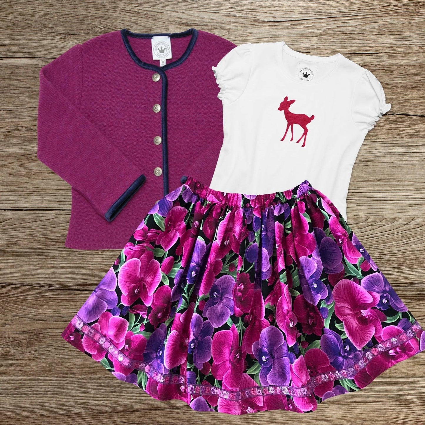 Die feine Strickjacke in klassischem Linksstrick harmoniert durch ein kräftiges Brombeer mit einer dunkelroten Samtpaspel. Der Trachten Mädchenjanker ist aus feinster englischer Merinowolle. Durch eine spezielle Waschung wird die Wolle sehr weich und angenehm tragbar für Kinder. Die schönen Jacken werden in Bayern gestrickt und hochwertig verabreitet. Eine gerade schlichte Jacke, die nicht zum Dirndl passt, auch auf Jeans, über Kleider, Shirt oder Röcke sieht er toll aus. Besonders schön ist die kontrastfarbene Samtpaspel am Ärmel und der Knopfleiste. Süß ist er auch im Partnerlook mit Mami- die Jacken gibt es auch für Damen in vielen Farben.