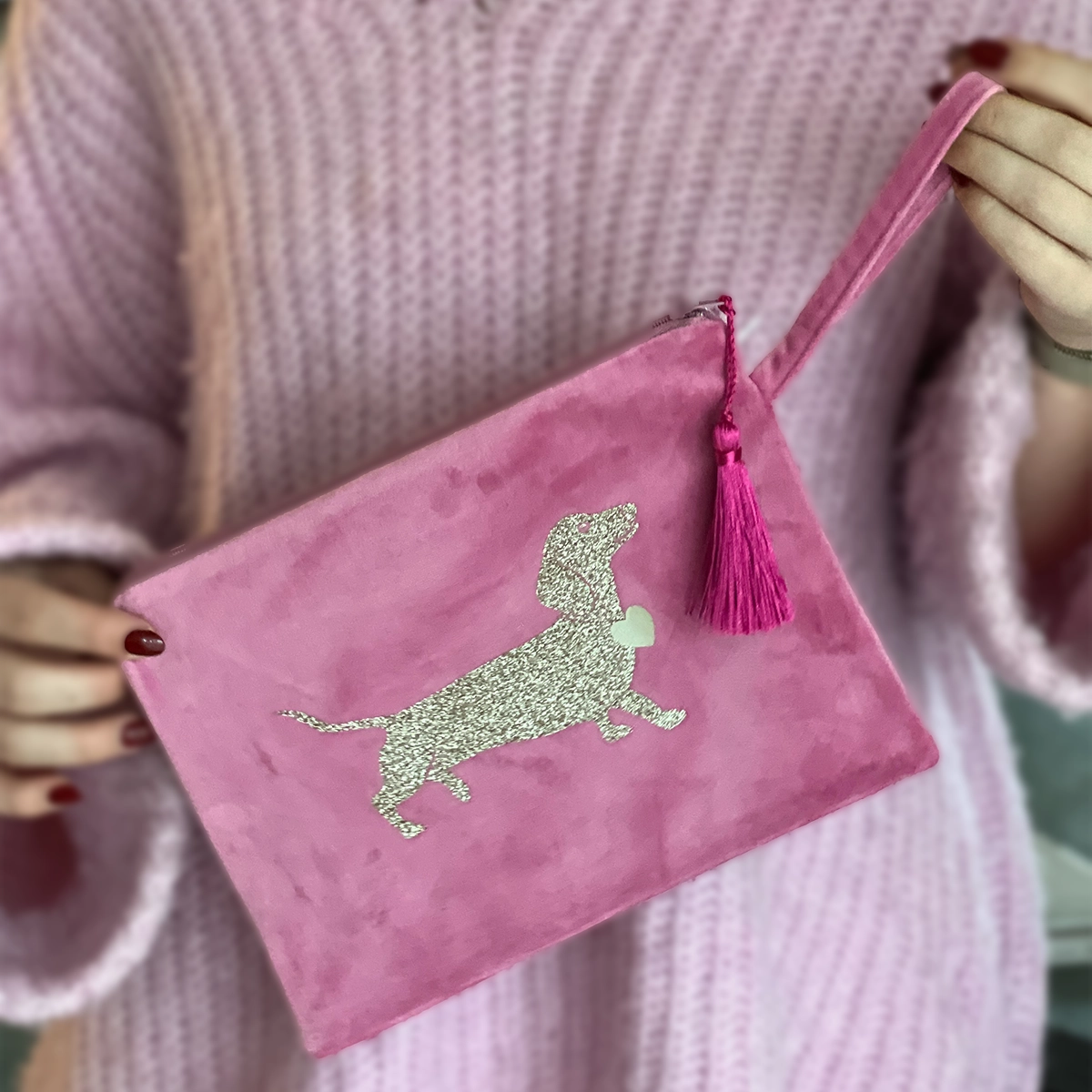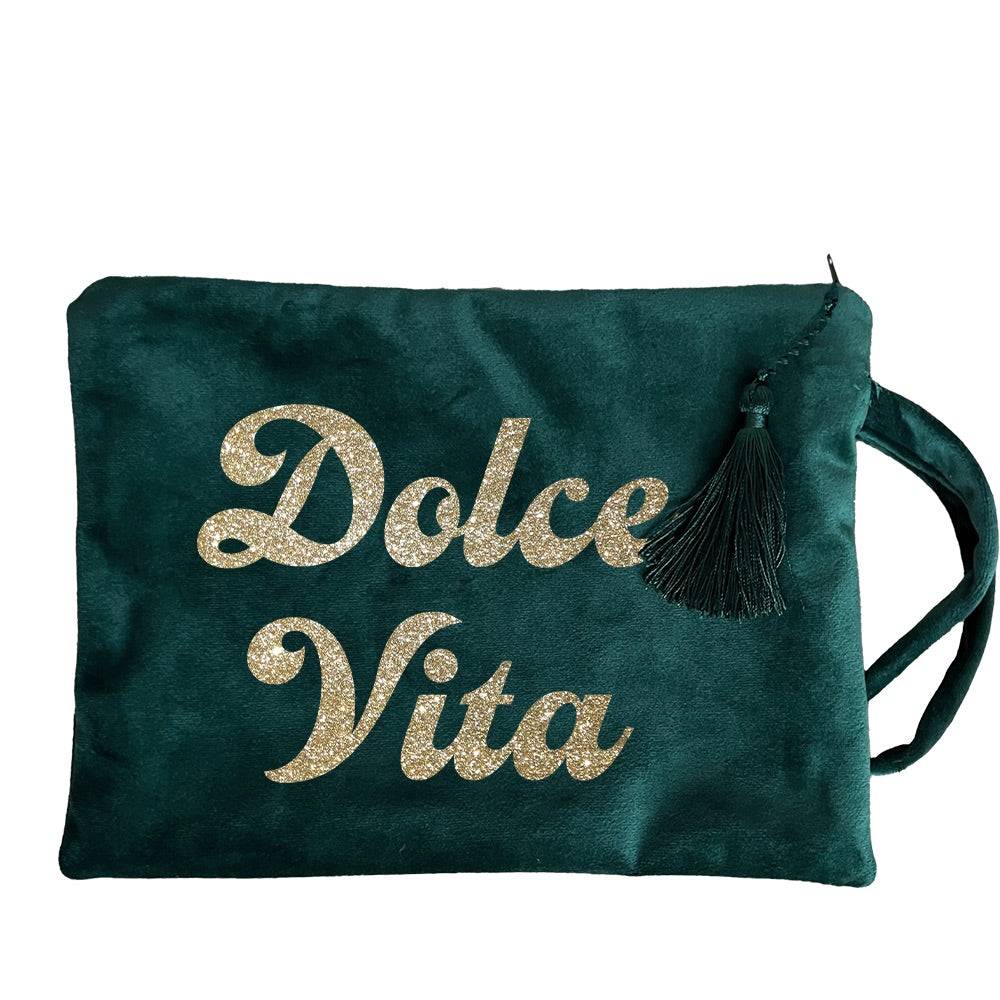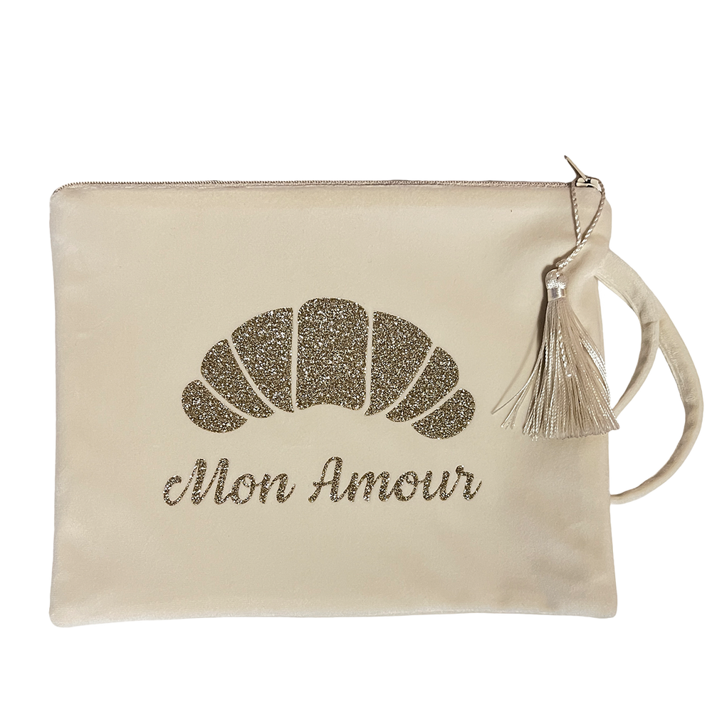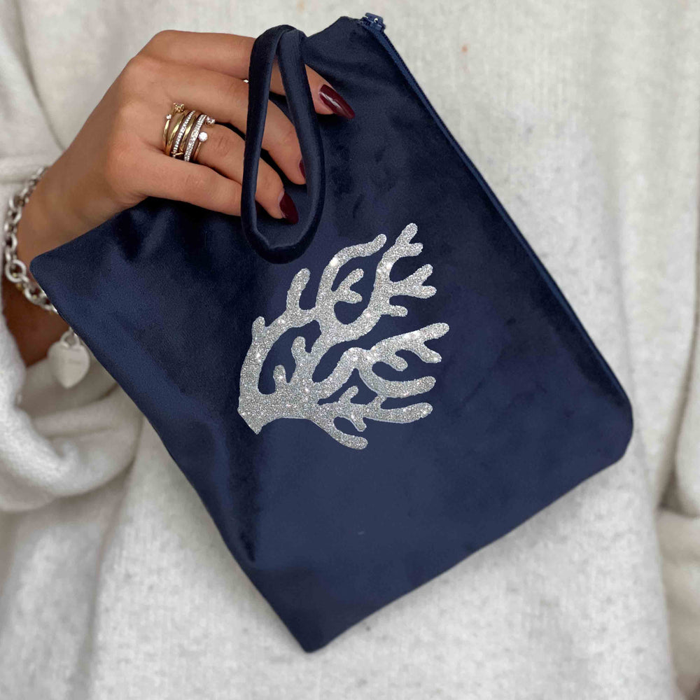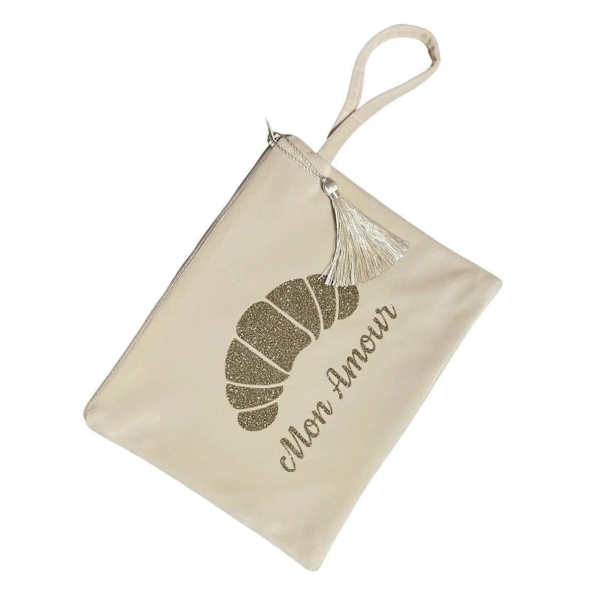 aus feinem Samt oder Leinen sind gefüttert und werden von Hand mit originellen Print Motiven aus Samt oder Glitzer verziert. Die süße Tasche kann man als Clutch tragen oder als zusätzliche „all-in-one bag“ in einer großen Shopper Tasche einsetzen.