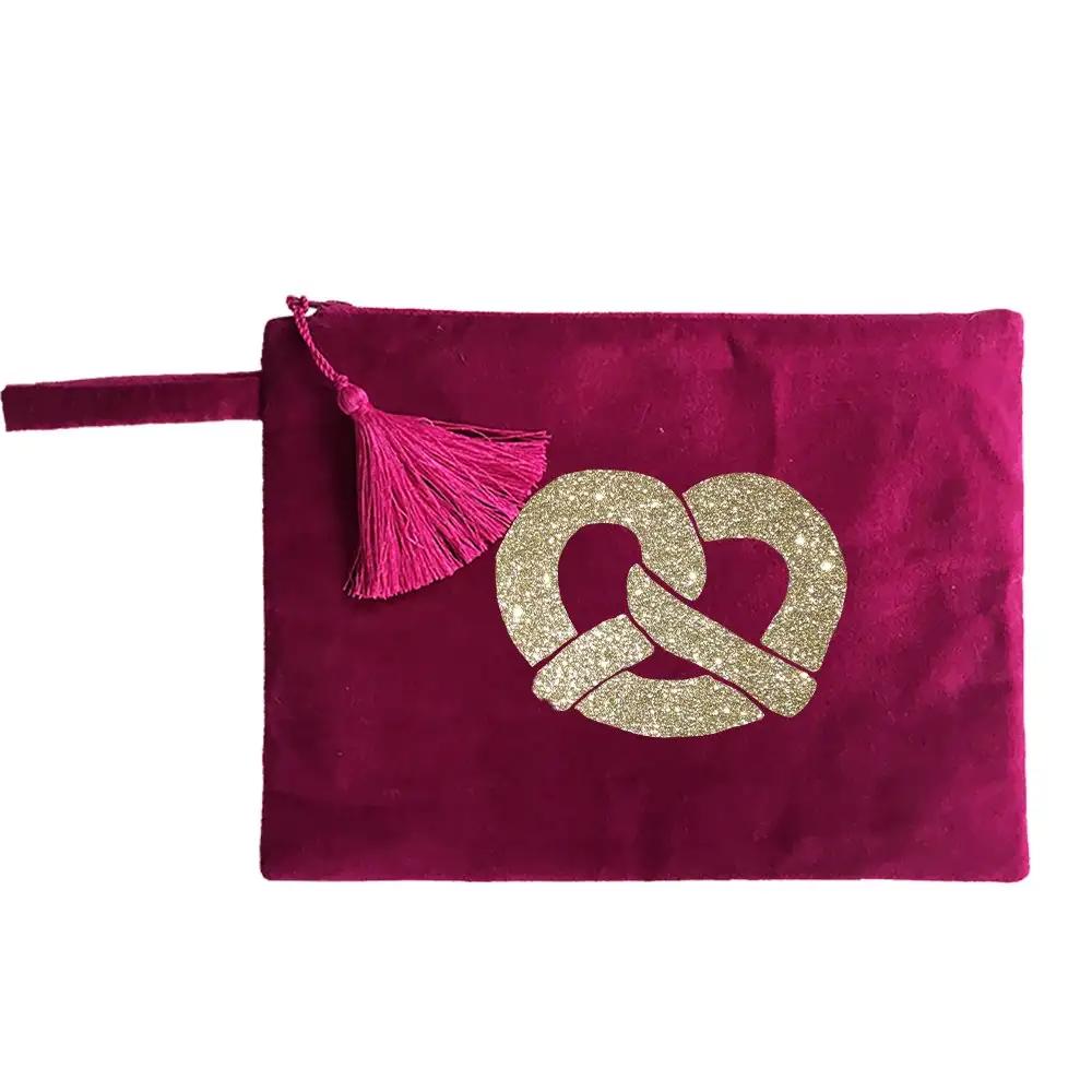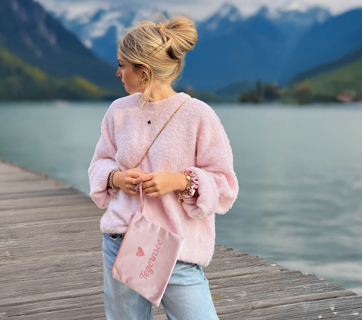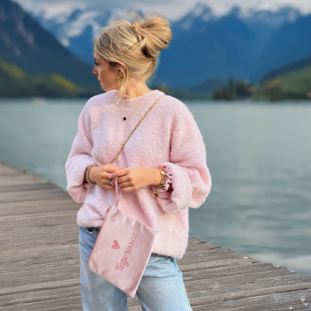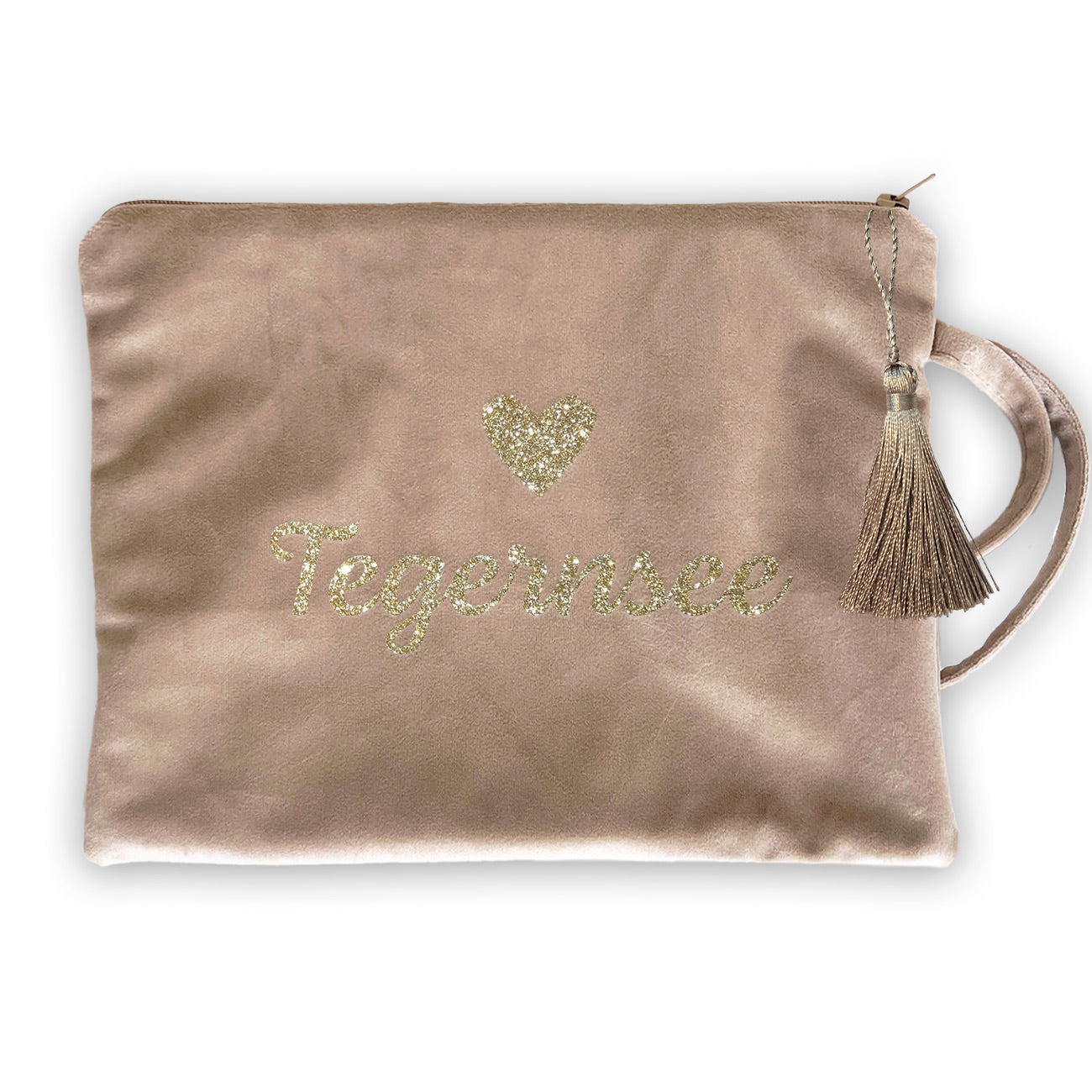 Ausserdem ist sie ein hübsches Geschenk für Frauen und große Mädchen. Zum Tragen gibt es eine Samtschlaufe, am Reissverschluss hängt eine trendige Satin Quaste.