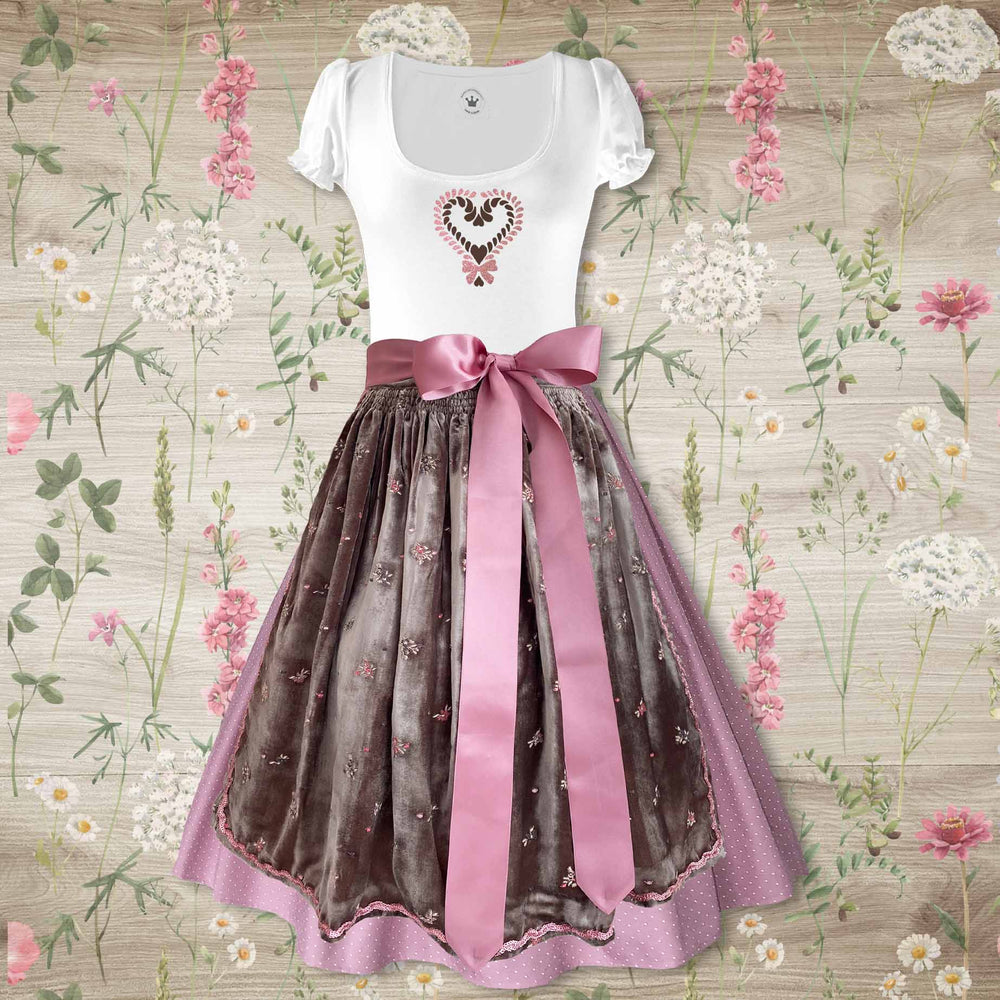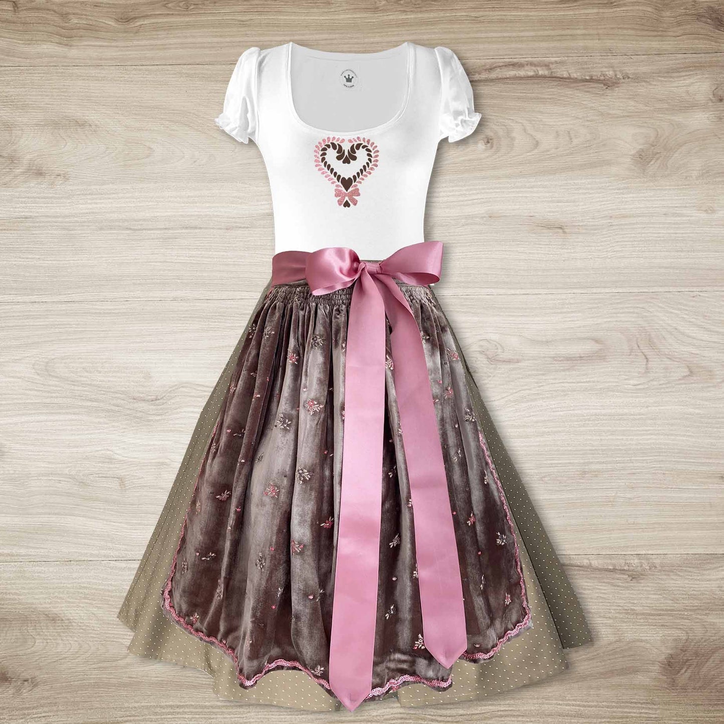 Das Dirndl "Karamell" ist eines unserer Highlights. Der wunderschön weich fallende Samt ist eine Mischung aus Seide und Viscose. Er wird in Frankreich gefertigt und aufwendig bestickt. Die Fertigung ist ein echtes handwerkliches Kunstwerk. Das karamellfarbene Braun ist edel und lässt sehr schön zum rosa oder beigen Rock kombinieren. Die feine bestickte Samtschürze kommt dann besonders schön zur Geltung.