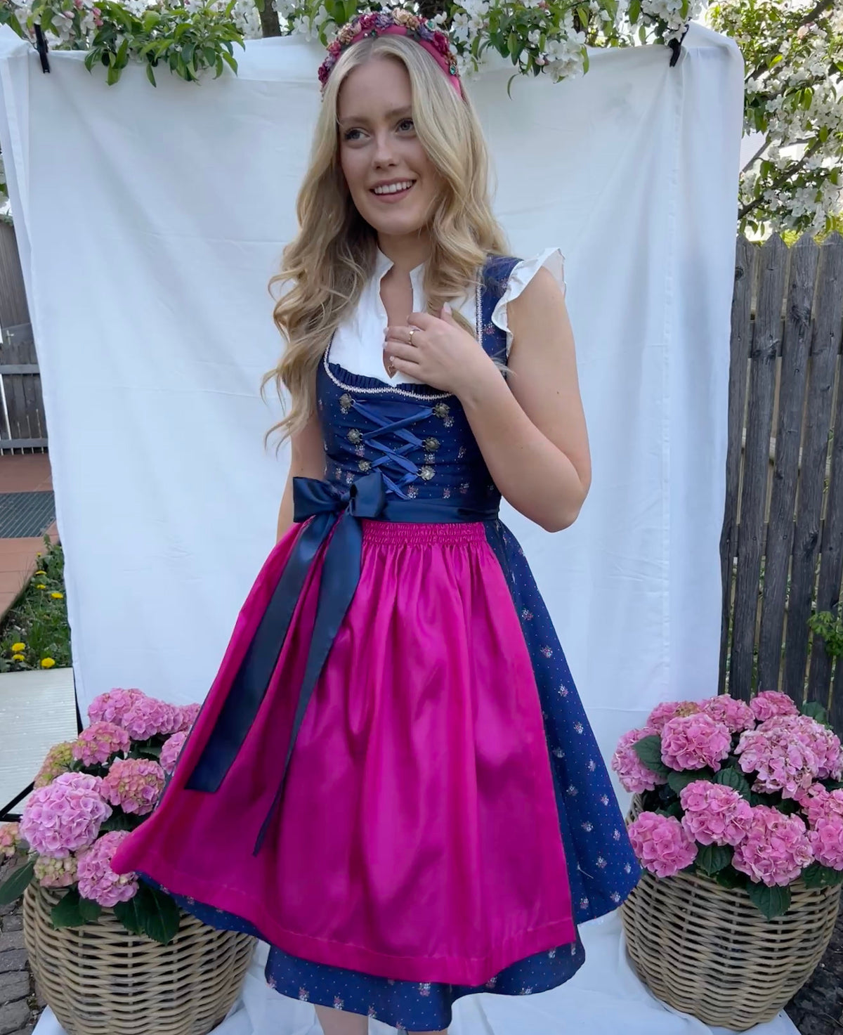 Regulärer Preis €279,00Dieses Dirndl besticht durch die harmonische Kombination von leuchtendem Blau und Pink. Sie können wählen zwischen der Schürze in uni Pink oder mit kontrastfarbenen blauen Bändern. Das schmal geschnittene, dekolletierte Dirndlshirt ist handbedruckt – wählen Sie Ihr bevorzugtes Motiv. Perfekt abgerundet wird das Dirndl durch unseren farblich abgestimmten Janker.