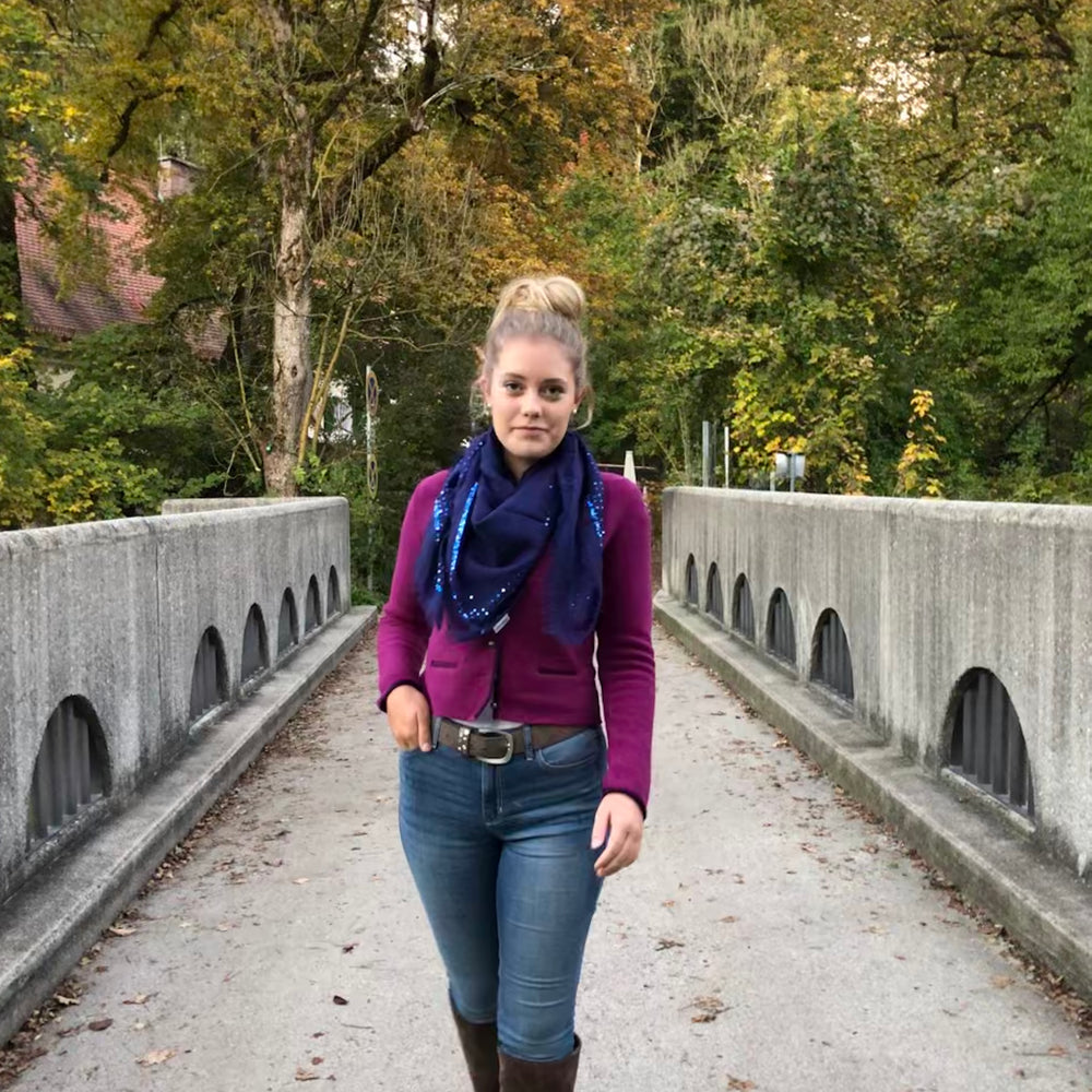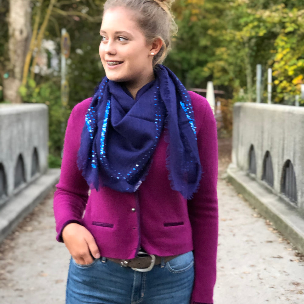 Regulärer Preis €49,00Wunderschönes weiches Wolltuch mit Paillettenstickerei. Das edle Tuch ist quadratisch mit feinen Fransen ringsherum. Die 4 Ecken des Tuches zieren feine Quasten.
