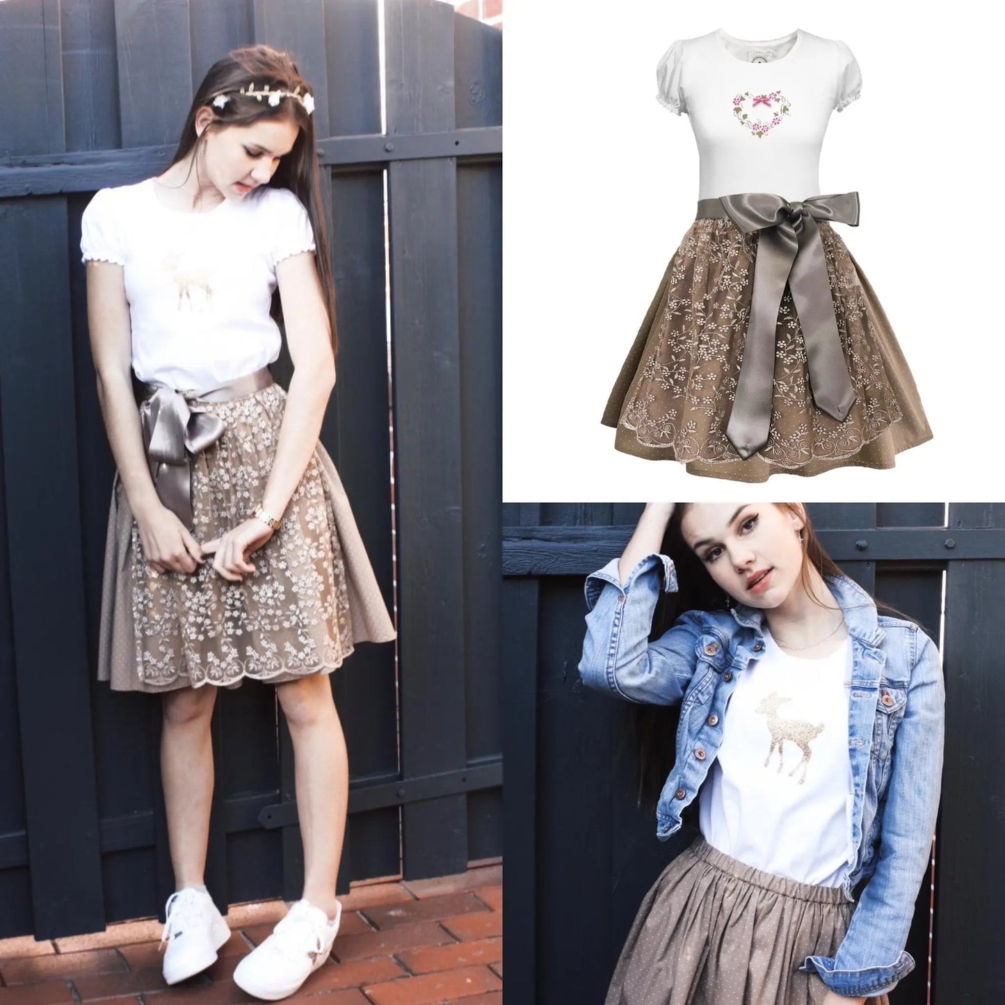 Unser Kinder Dirndl ist eine neue Variante des klassischen Dirndls, jedoch ist es bequem und frisch zugleich. Das Besondere ist die Wandlungsfähigkeit, denn es ist 3-teilig und besteht ausRock, Schürze und Dirndl Shirt. Dank des bequemen Gummizuges am Rock können die Kinder sich ganz ungezwungen bewegen, tanzen und toben ohne das etwas drückt oder zwickt. Ohne Schürze kann man den Rock und das Shirt toll mit einer Jeansjacke und Sneaker kombinieren oder einfach nur das süße Motiv Shirt zur Shorts. Sie werden überrascht sein, welche Möglichkeiten sich bieten. Abgesehen davon ist es natürlich auch unglaublich praktisch, da man alle Teile einzeln waschen kann ;-)