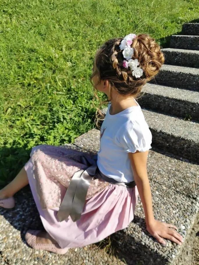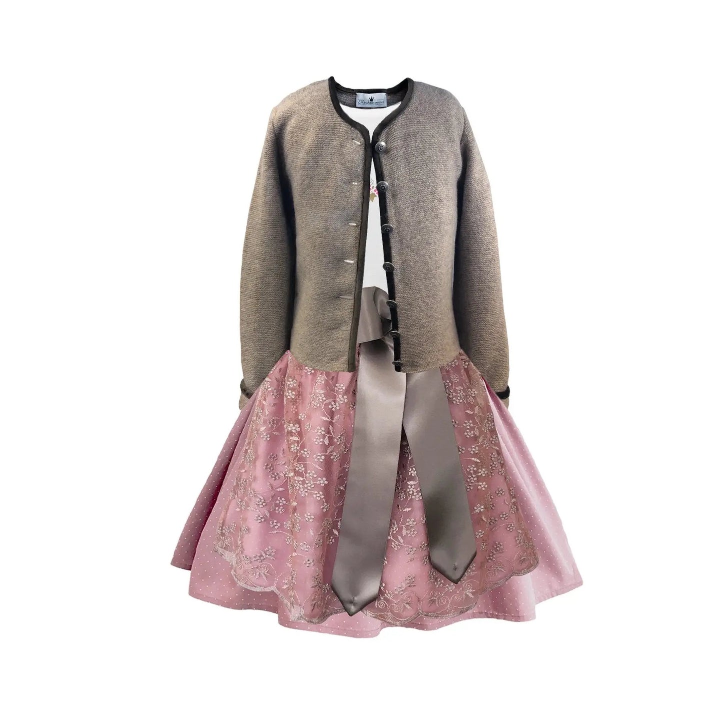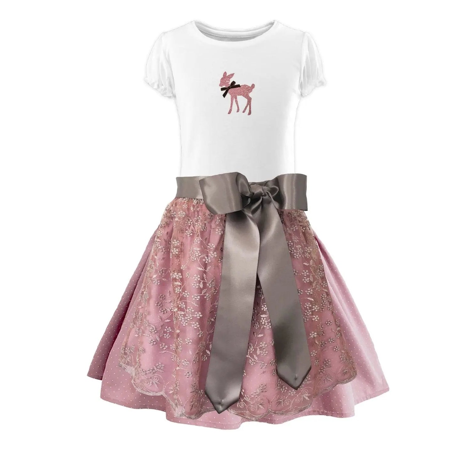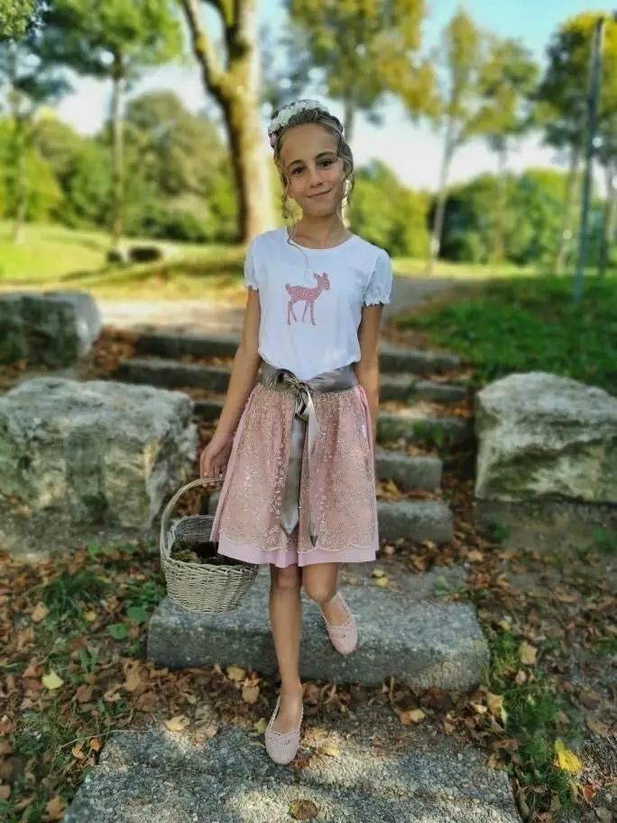 Wir lieben das Dirndl "Prinzessin" weil es nicht nur so heißt sondern man auch sich auch genauso darin fühlt und aussieht. Der hellrosa oder beige Rock mit kleinen Tupfen wird mit einer zarten beigefarbenen Spitzen Schürze kombiniert. Das Shirt wird von Hand mit ein Bambi aus rosa Glitzer oder einem Herz aus Blütenranken und einer Samtschleife verziert. Entschieden sie selbst welches Shirt ihnen besser gefällt oder kaufen sie nicht ein 2. Shirt dazu , wenn eines in die Wäsche muss :-) Ergänzen lässt sich das hübsche Dirndl mit unseren farblich passenden Kinder Janker "Elisabeth". Sehr süß ist es natürlich auch im Partnerlook mit der Mama!