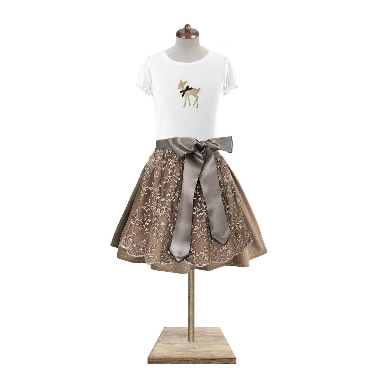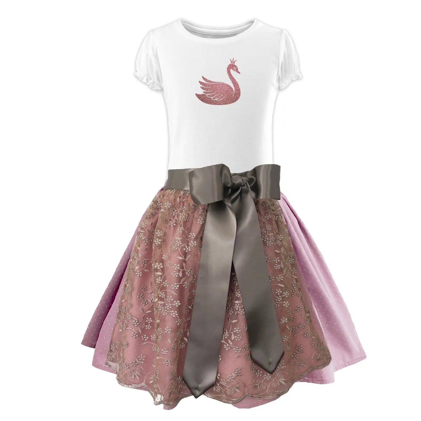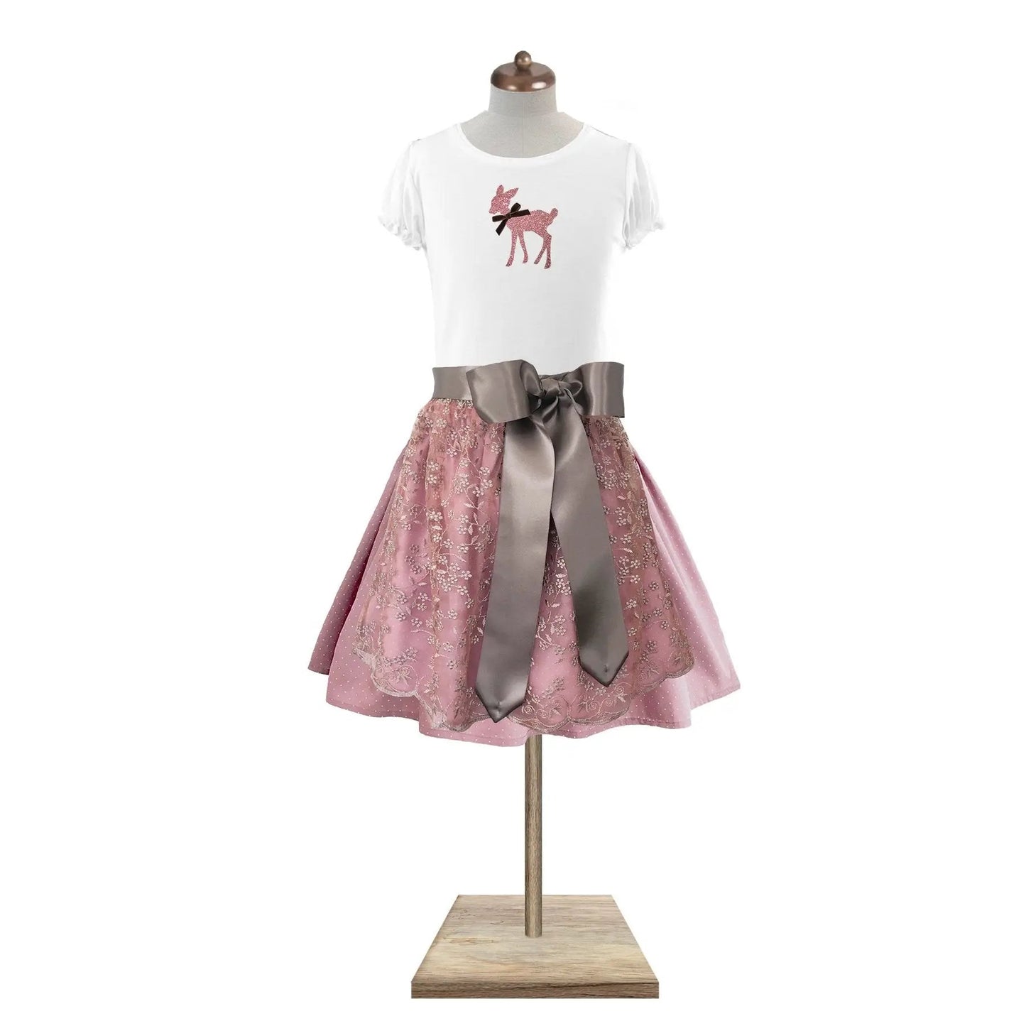 Wir lieben das Dirndl "Prinzessin" weil es nicht nur so heißt sondern man auch sich auch genauso darin fühlt und aussieht. Der hellrosa oder beige Rock mit kleinen Tupfen wird mit einer zarten beigefarbenen Spitzen Schürze kombiniert. Das Shirt wird von Hand mit ein Bambi aus rosa Glitzer oder einem Herz aus Blütenranken und einer Samtschleife verziert. Entschieden sie selbst welches Shirt ihnen besser gefällt oder kaufen sie nicht ein 2. Shirt dazu , wenn eines in die Wäsche muss :-) Ergänzen lässt sich das hübsche Dirndl mit unseren farblich passenden Kinder Janker "Elisabeth". Sehr süß ist es natürlich auch im Partnerlook mit der Mama!