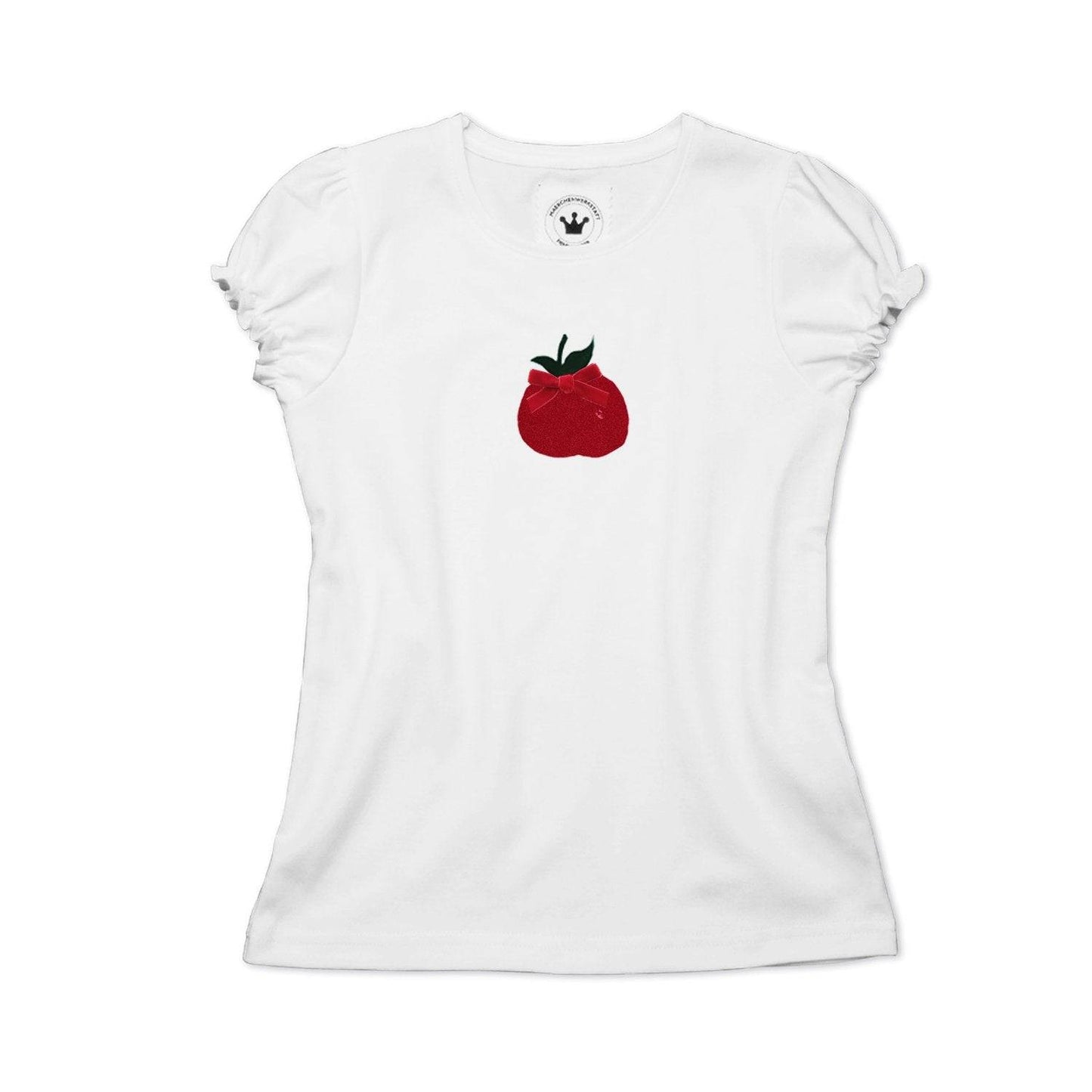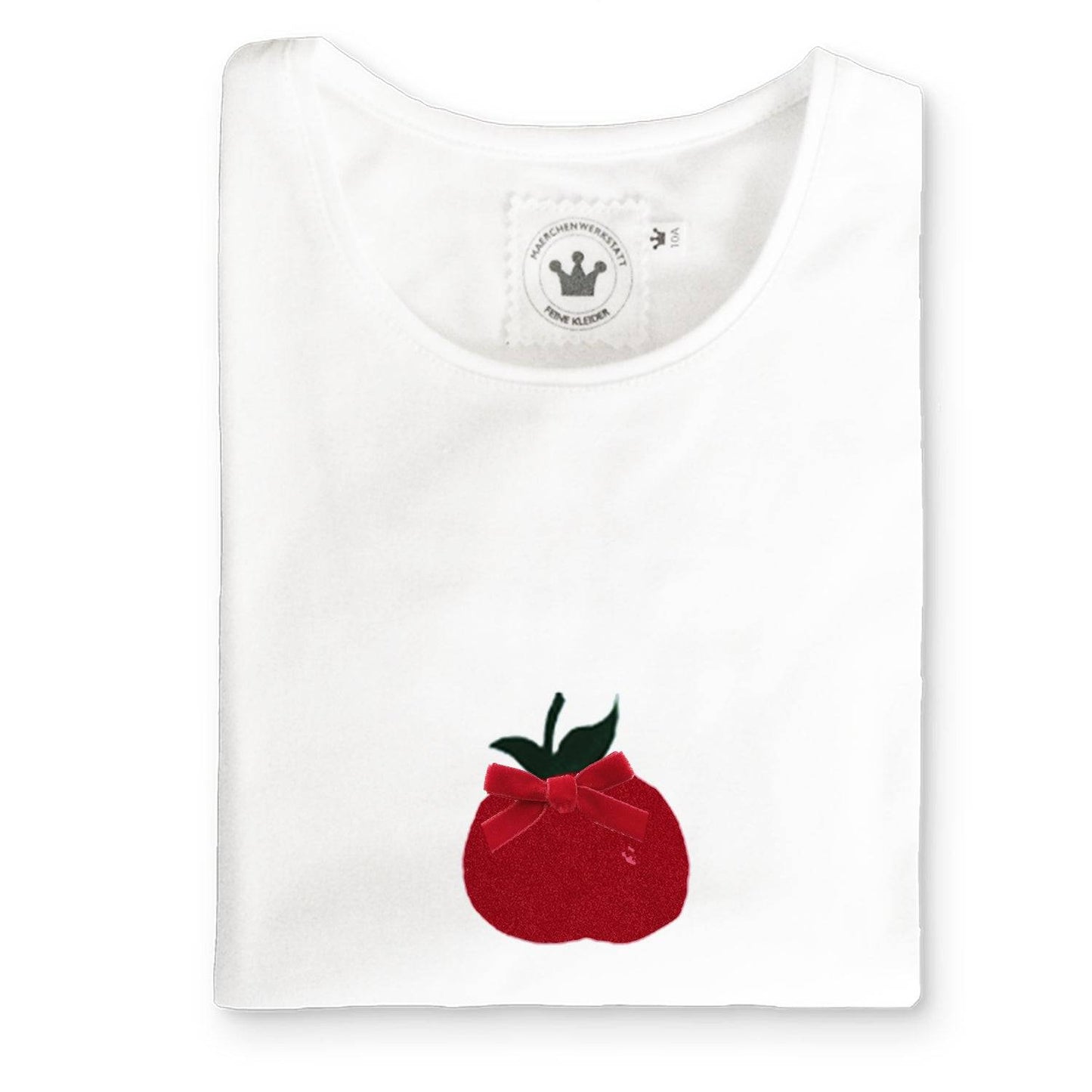 Unser weiches Kurzarmshirt für Mädchen gibt es in 2 Modellen: die sportliche Variante mit kurzen glatten Arm und das mädchenhafte Dirndl T-Shirt mit hübschen Rüschen und feinem Gummizug am Arm. Der Apfel mit den Blätterranken wird von Hand gedruckt. Die weiße Basisfarbe unserer Shirts passt zu jedem Stil und Outfit. Besonders fein sieht es zu unseren passenden Märchendirndl oder Sommerröckchen aus. Sehr schön ist es auch mit Jeans oder Shorts .