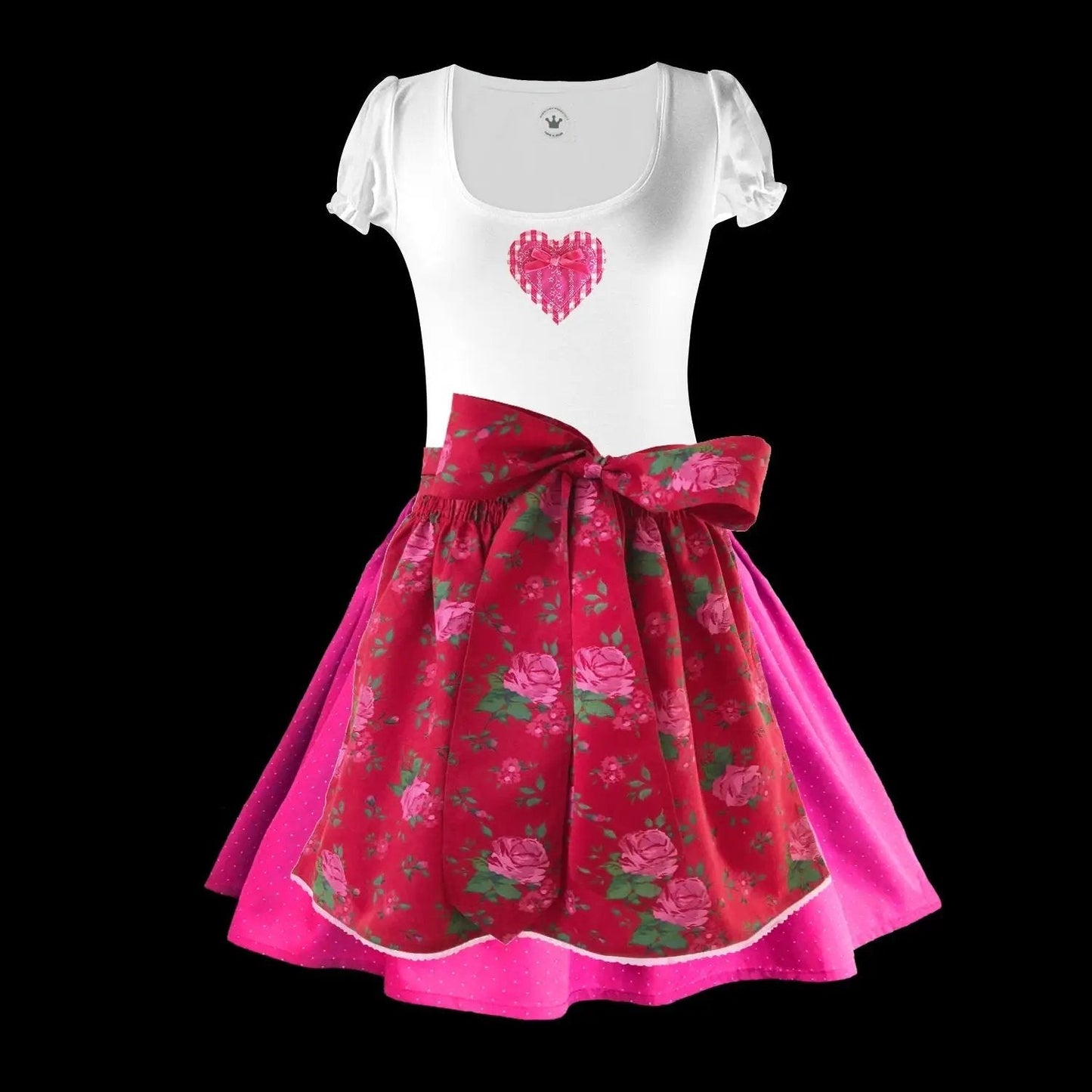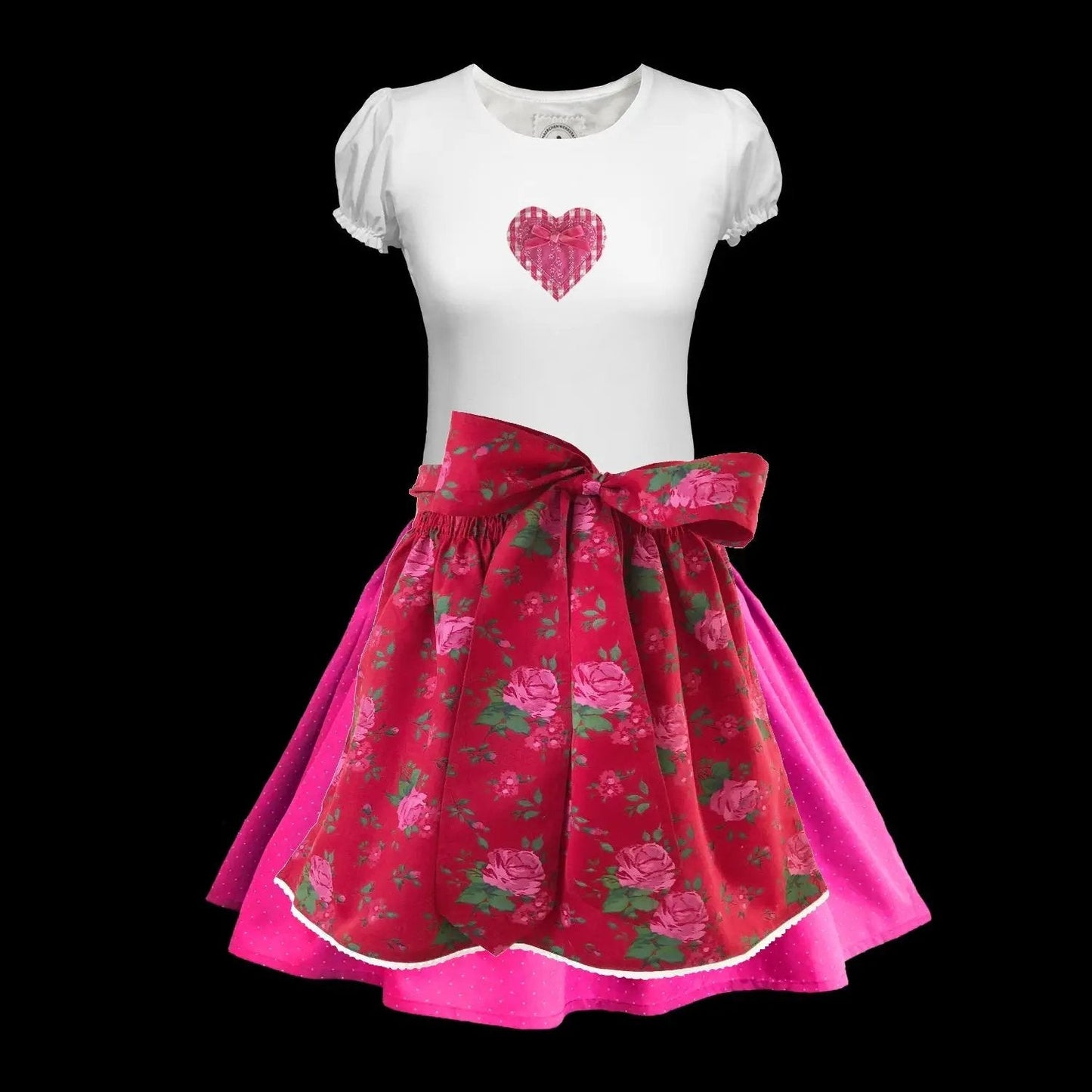 Der pinkfarbeneTupfenrock wird kombiniert mit einer feine Rosenbedruckten Schürze aus Baumwollsatin und einem Dirndlshirt mit Trachtenmotiv. Das Stoffherz wird von Hand genäht und mit einer Samtschleife verziert, ebenso wie die Ballerina mit Samt und Glitzer. Die aufwendigen Motive werden alle von Hand in Bayern gearbeitet. Bitte wählen sie unter "Motiv" welches Shirt Motiv sie wünschen. Und falls es mal nicht so schick sein soll, dann lässt man die Schürze weg und trägt den Rock einfach solo mit dem Shirt. Ergänzen sie ihr Dirndl mit einem zweiten Shirt, dann hat man die Möglichkeit zu wechseln falls das Lieblingsshirt mal in die Wäsche muss.