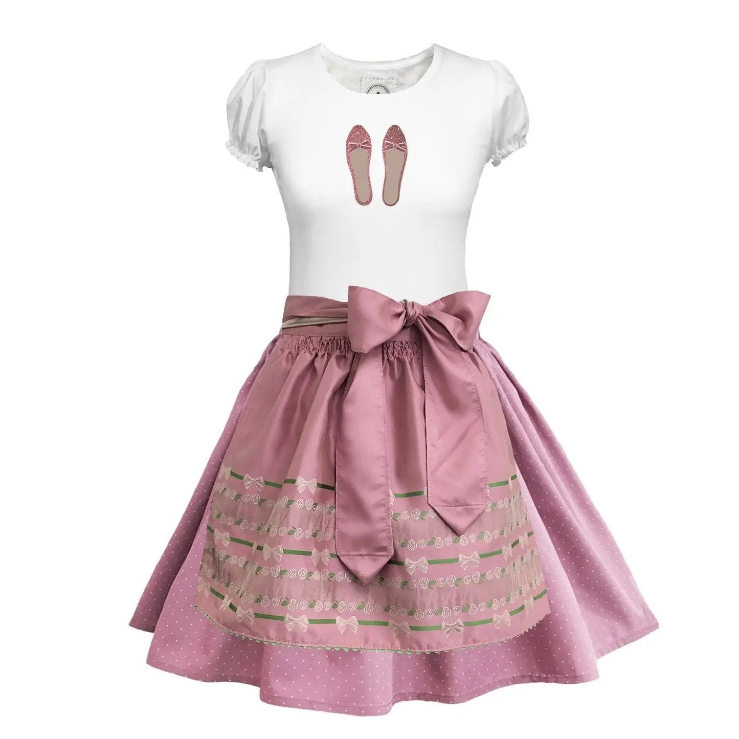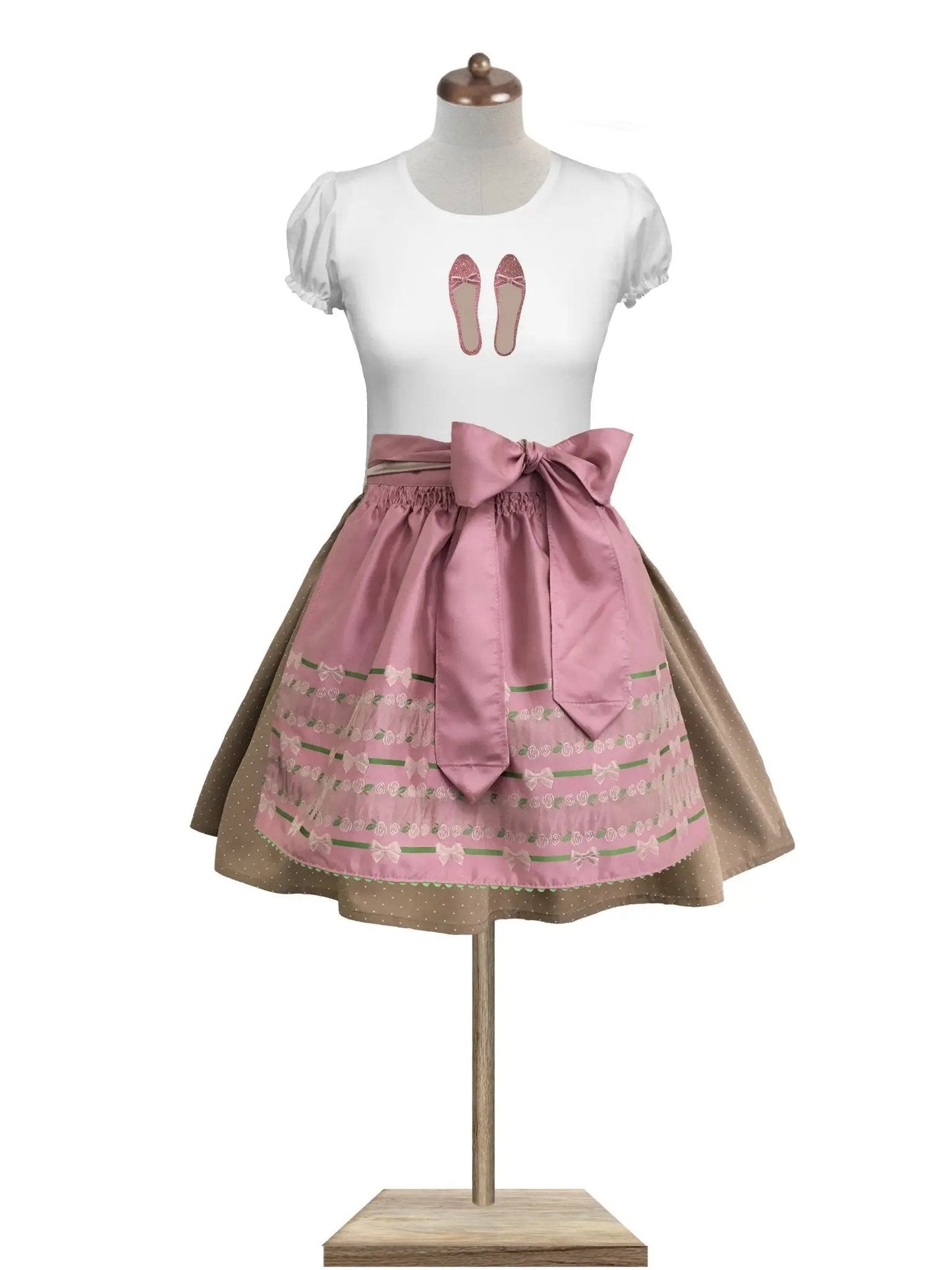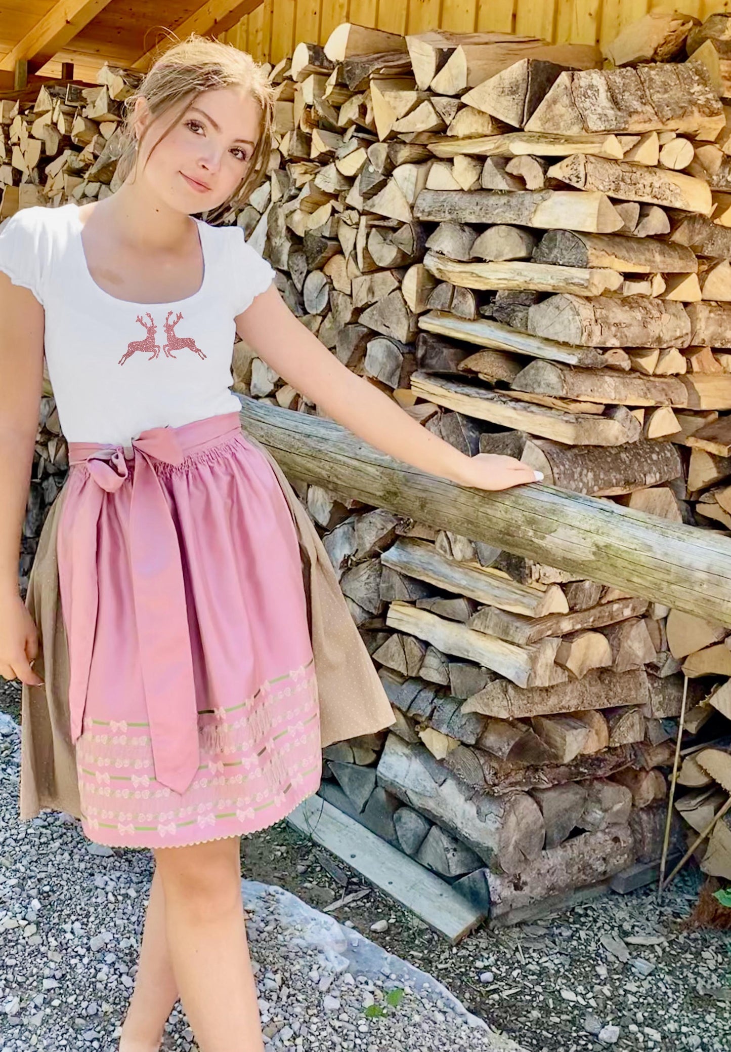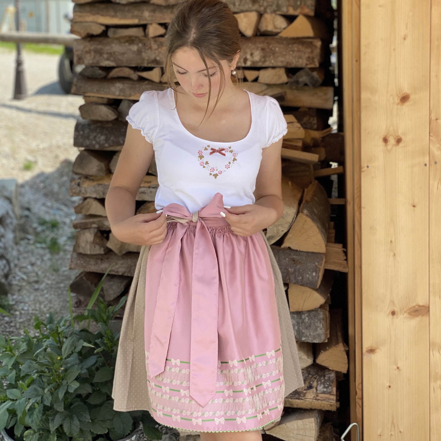 Der beige oder rose Tupfenrock wird kombiniert mit einer feine Schürze aus Hollender Seide in rose mit kleinen Schleifen und einem Dirndlshirt mit Trachtenmotiv. Die aufwendigen Motive werden alle von Hand in Bayern gearbeitet. Wählen sie unter "Motiv" welches Shirtmotiv (ob Herz oder Ballerina) sie wünschen. Falls es mal nicht so schick sein soll, dann lässt man die Schürze weg und trägt den Rock einfach solo mit dem Shirt. Ergänzen sie ihr Dirndl mit einem zweiten Shirt, dann hat man die Möglichkeit zu wechseln falls das Lieblingsshirt mal in die Wäsche muss.)