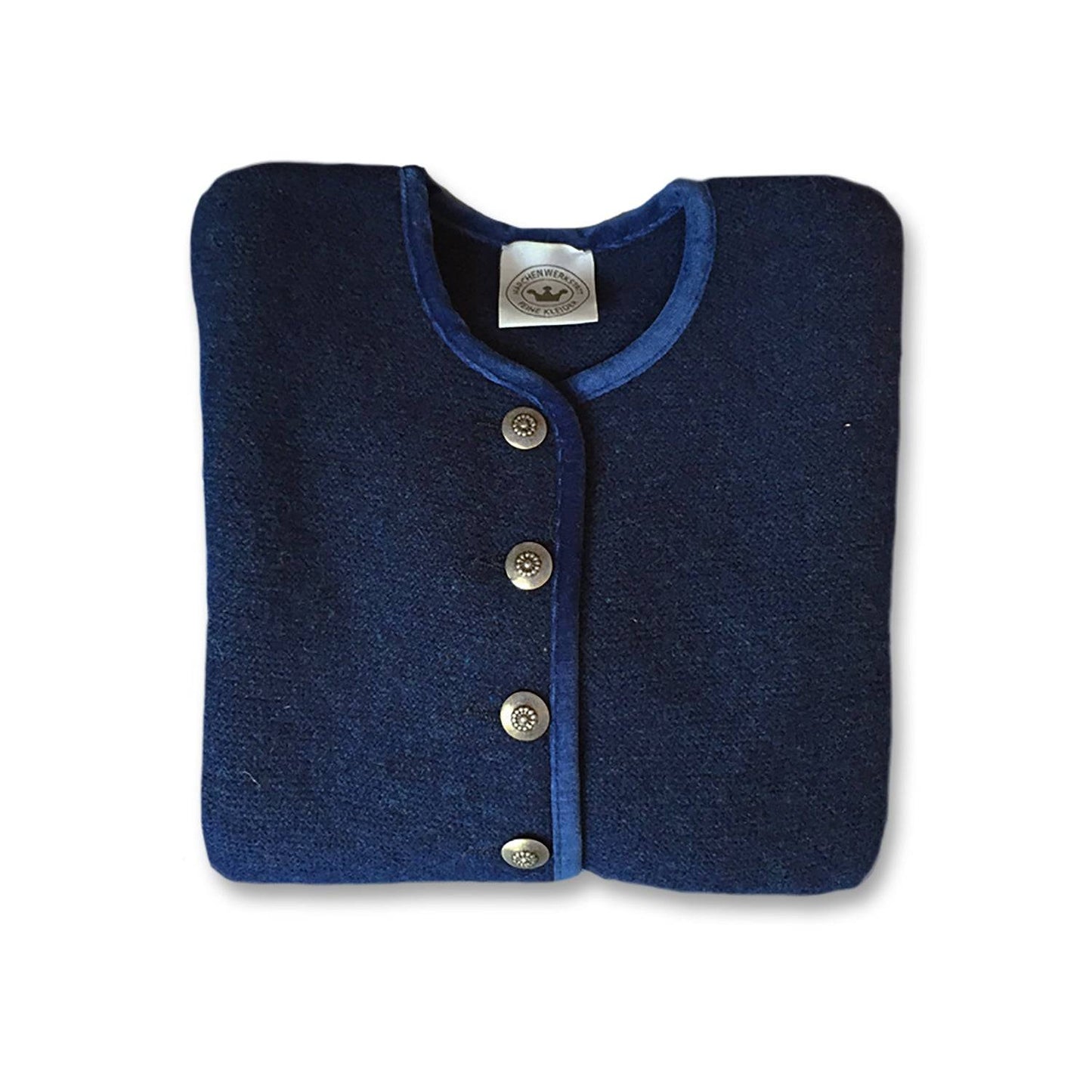 Die feine Strickjacke in klassischem Linksstrick harmoniert durch dunkelblau mit einer Ton in Ton abgestimmten Samtpaspel. Der Trachten Mädchenjanker "Elisabeth" ist aus feinster englischer Merinowolle. Durch eine spezielle Waschung wird die Wolle sehr weich und angenehm tragbar für Kinder. Die schönen Jacken werden in Bayern gestrickt und hochwertig verabreitet. Eine gerade schlichte Jacke, die nicht zum Dirndl passt, auch auf Jeans, über Kleider, Shiort oder Röcke sieht er toll aus. Besonders schön ist die kontrastfarbene Samtpaspel am Ärmel und der Knopfleiste. Süß ist er auch im Partnerlook mit Mami- die Jacken gibt es auch für Damen in vielen Farben.