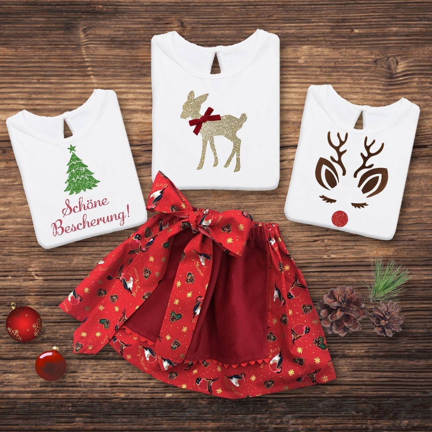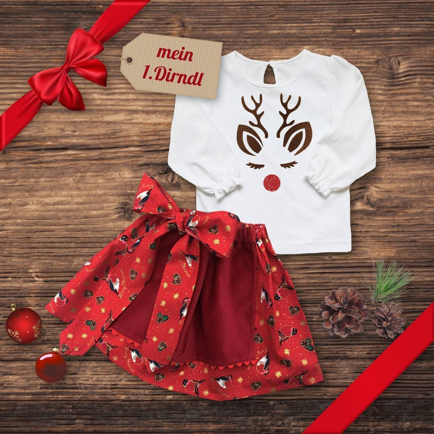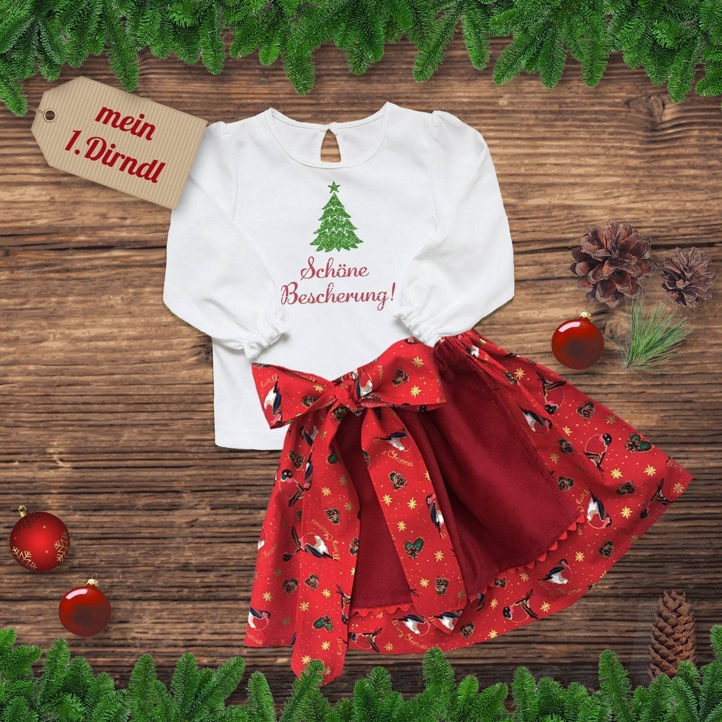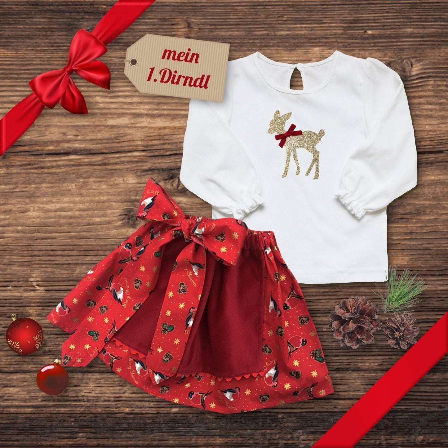 Das Erste Weihnachtsfest ist etwas ganz Besonderes, nicht nur für das Neugeborene, welches den Glitzer, den Duft und das festliche Stimmung noch gar nicht so recht aufnehmen kann. Vor allem für Mama, Papa und die Großeltern ist das erste Weihnachten mit Baby ein ganz wunderbares Fest. Genau dafür haben wir dieses entzückende Erste Dirndl entworfen. Es hat einen bequemen Gummizug und die rote weiche Samtschürze ist gleich mit angenäht, genau wie die Schleife. Eine bequemes und fesches Outfit zu gleich. Dazu das entzückende von Hand bedruckte Shirt mit seinen kleinen Rüschen am Ärmel. Es ist aus feinster weicher Baumwolle und wird im Nacken geknöpft für leichteres An- und Ausziehen. Sie müssen sich nur für ein Motiv entscheiden. Ein entzückendes Geschenk zum 1. Weihnachtsfest, zur Geburt, zum 1. Geburtstag oder zur Taufe. Den Rock gibt es in einer Größe passend für 12 bis 24 Monate, er wächst wunderbar mit, somit haben sie lange Freude daran und können ihn ja im nächsten Jahr einfach mit einem neuen Shirt ergänzen. Das Shirt wird in Größe 18 Monate geliefert.