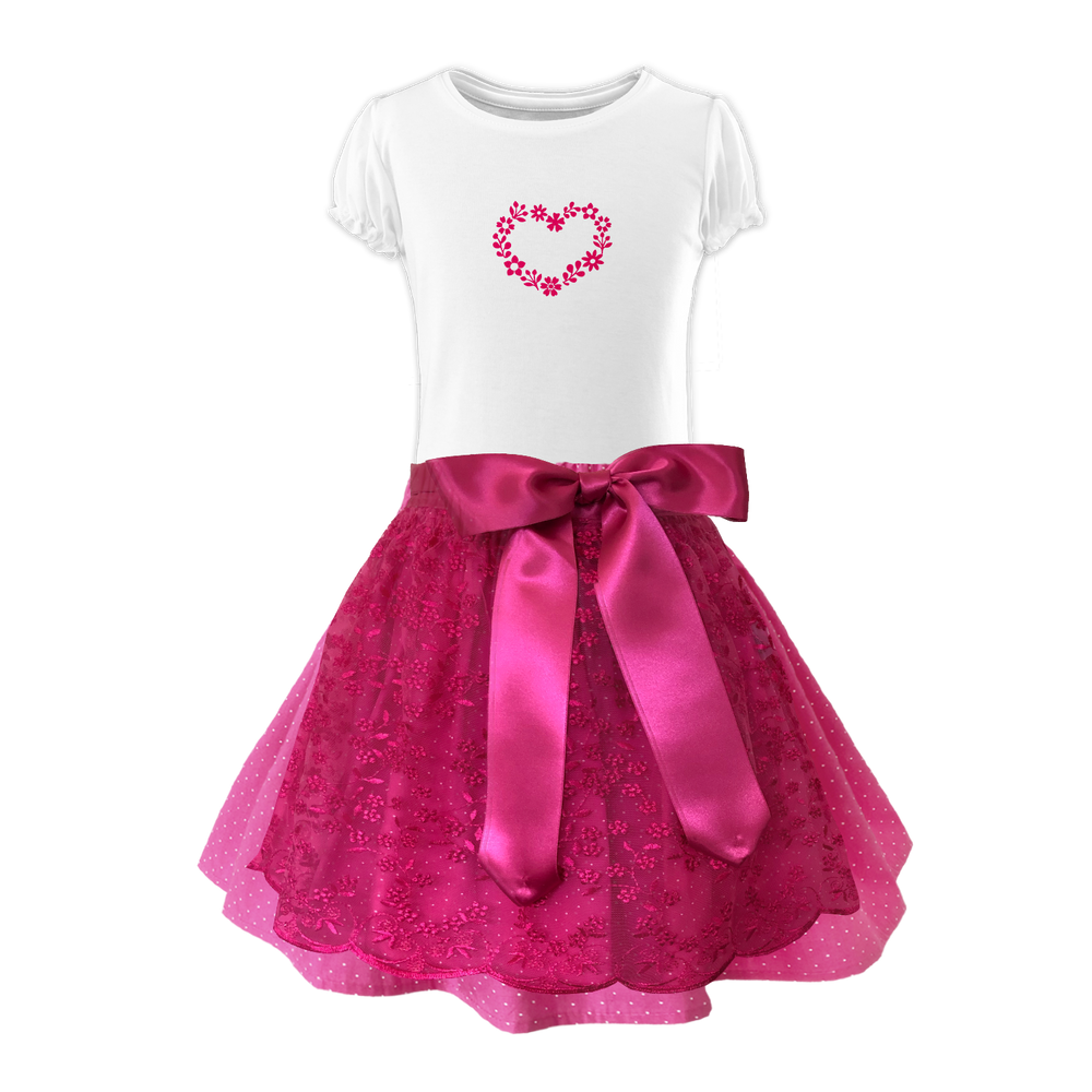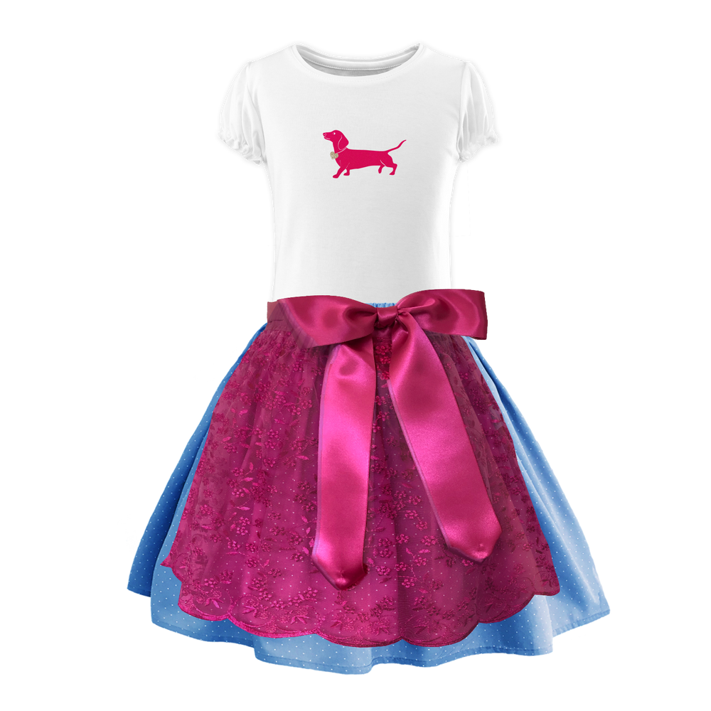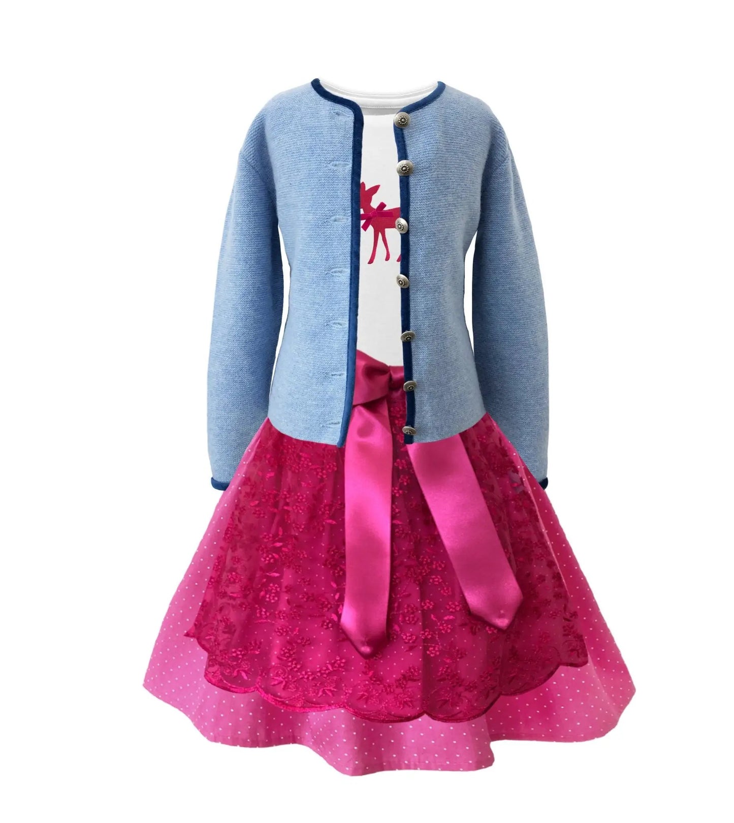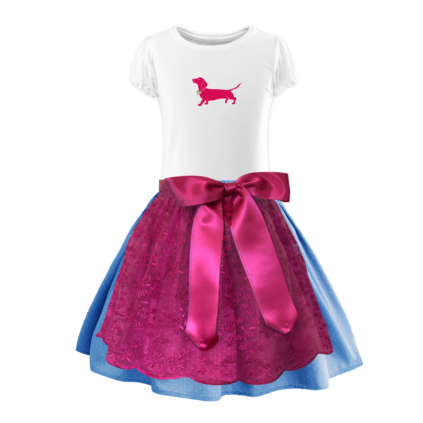 Wir lieben das Dirndl "Aschenputtel"! Der pinkfarbene Rock mit kleinen Tupfen wird mit einer zarten pinkfarbenen Spitzen Schürze mit kleinen Blümchen und langen Satinbändern kombiniert. Beim Shirt können sie wählen welches Motbiv sie am liebsten mögen: ein Herz aus Blüten oder ein Reh aus Samt oder doch lieber die süßen Ballerinas oder eien Brezel. Entschieden sie selbst welches Shirt ihnen besser gefällt oder kaufen sie noch ein 2. Shirt dazu , wenn eines in die Wäsche muss :-) Ergänzen lässt sich das hübsche Dirndl mit unseren farblich passenden Kinder Janker. Sehr süß ist es natürlich auch im Partnerlook mit der Mama!