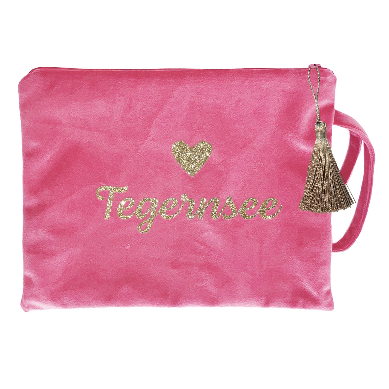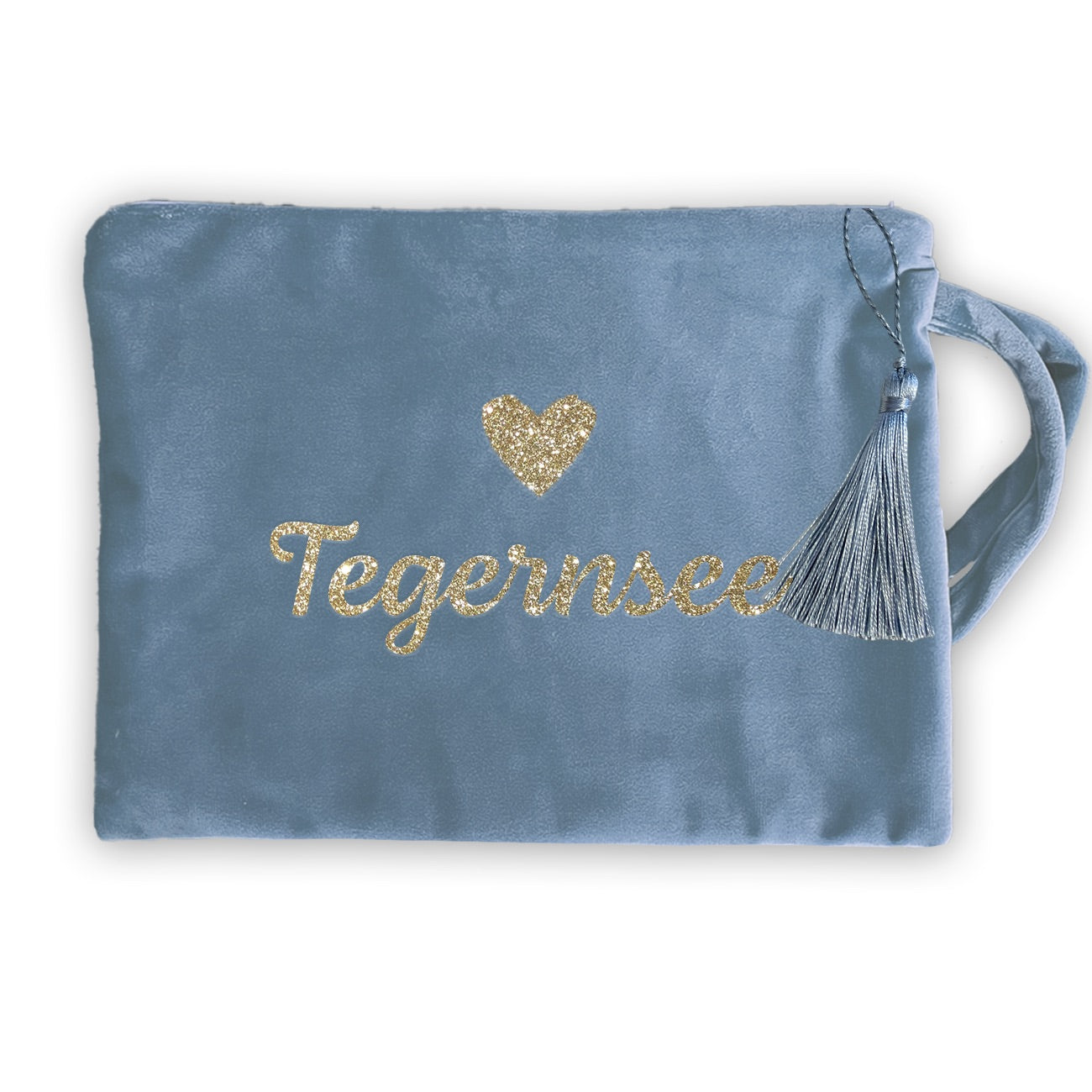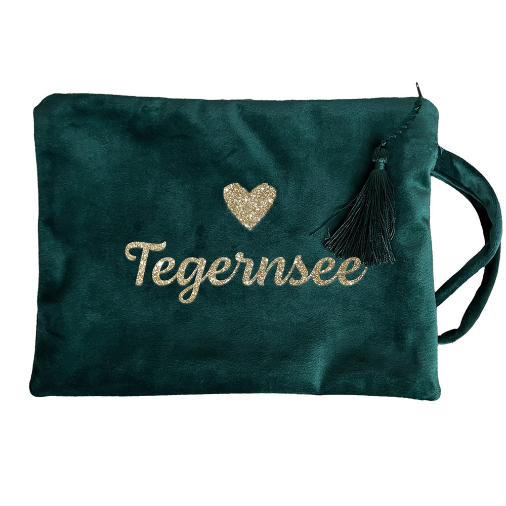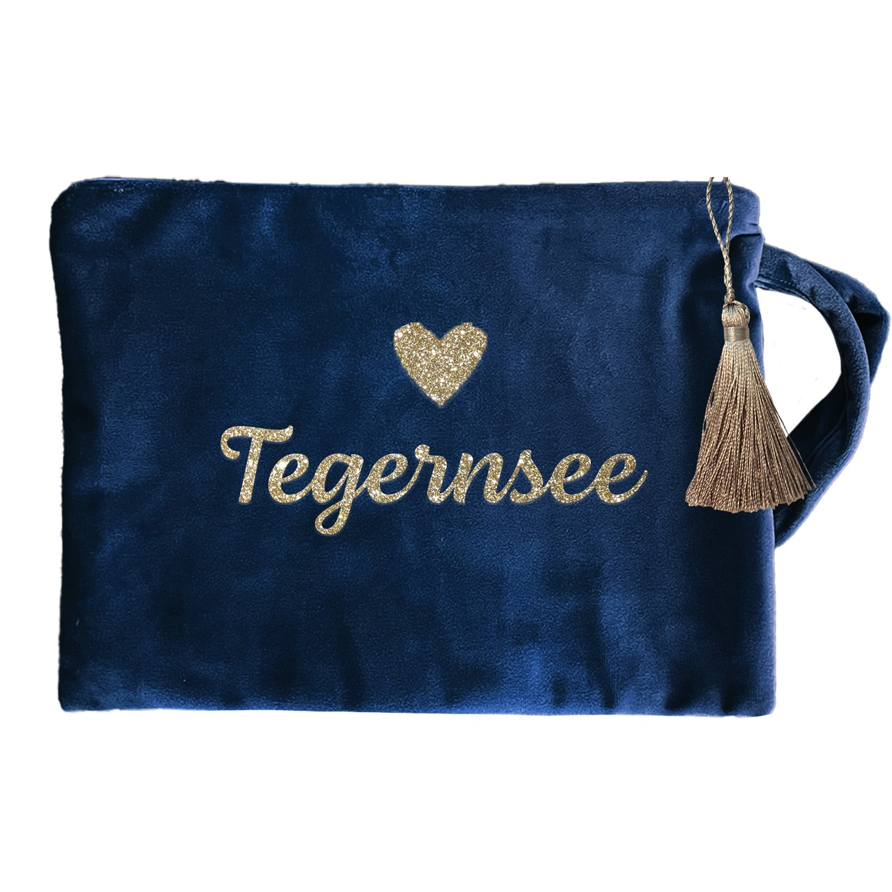 Die wunderschöne Kosmetiktasche aus Samt ist mit einem kleinen gold glitzernden Herzl und "Tegernsee" verziert. Eine süße Tasche für Kleinigkeiten oder als Urlaubserinnerung.