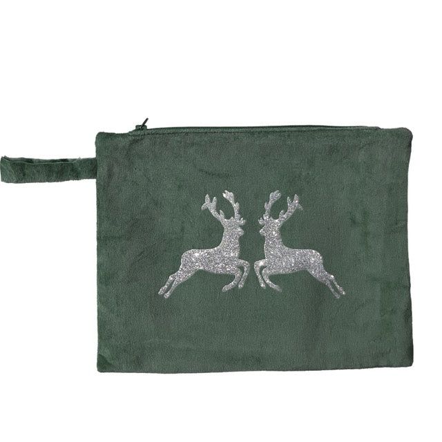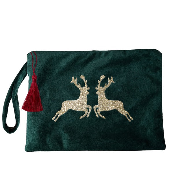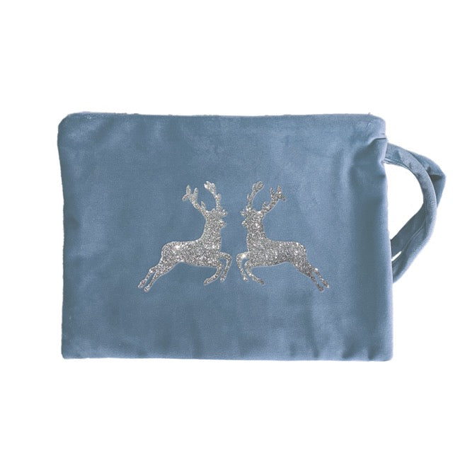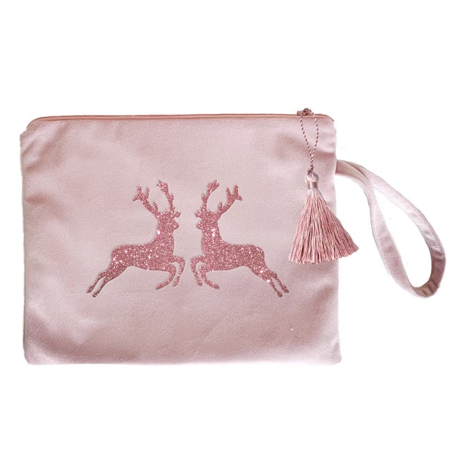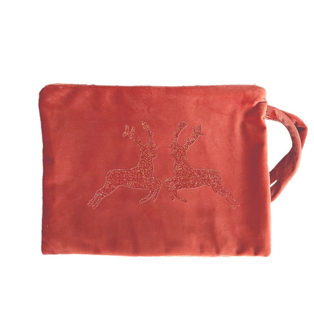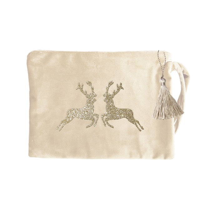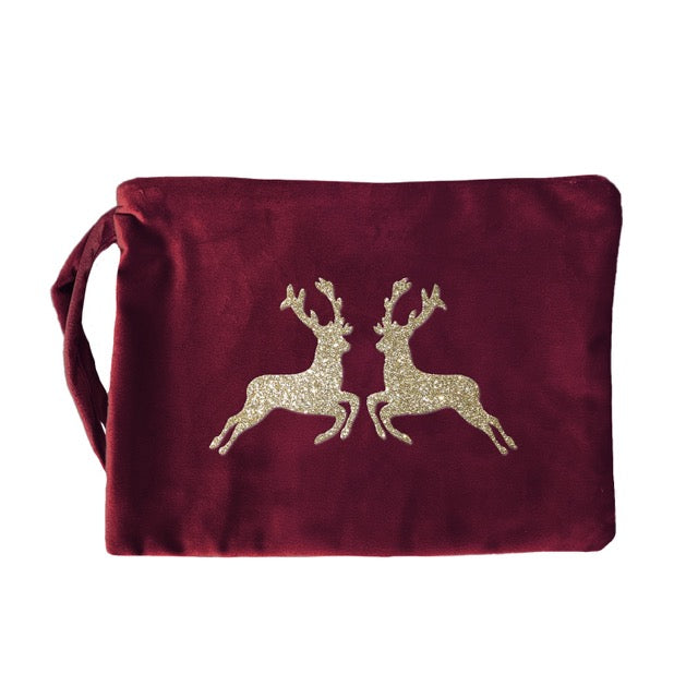 Die Kosmetiktasche aus feinem Samt ist mit Baumwolle abgefüttert und mit glitzernden Hirschen verziert. Der Reißverschluss der Kosmetiktasche ist mit einer entzückenden Quaste als Anhänger versehen. Die Drucke werden in unserem Atelier in München angefertigt, sodass wir auch spezielle Wünsche berücksichtigen können. Diese Kosmetiktasche ist auch ein bezauberndes Geschenk für Frauen und große Mädchen.
