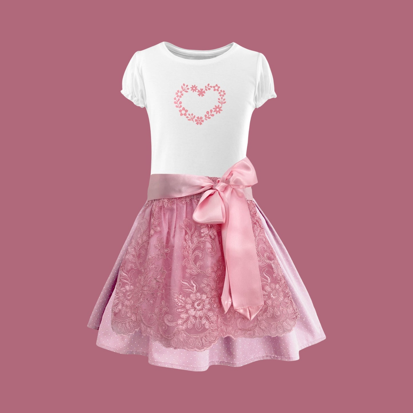 Ein wunderschönes Spitzen Dirndl in rosarot. Unser Dirndl ist 3-teilig und besteht aus Dirndlshirt mit handgefertigten Herz aus rosa Glitzer, dem rosa Rock mit Tupfen und einer zart rosa Spitzenschürze.