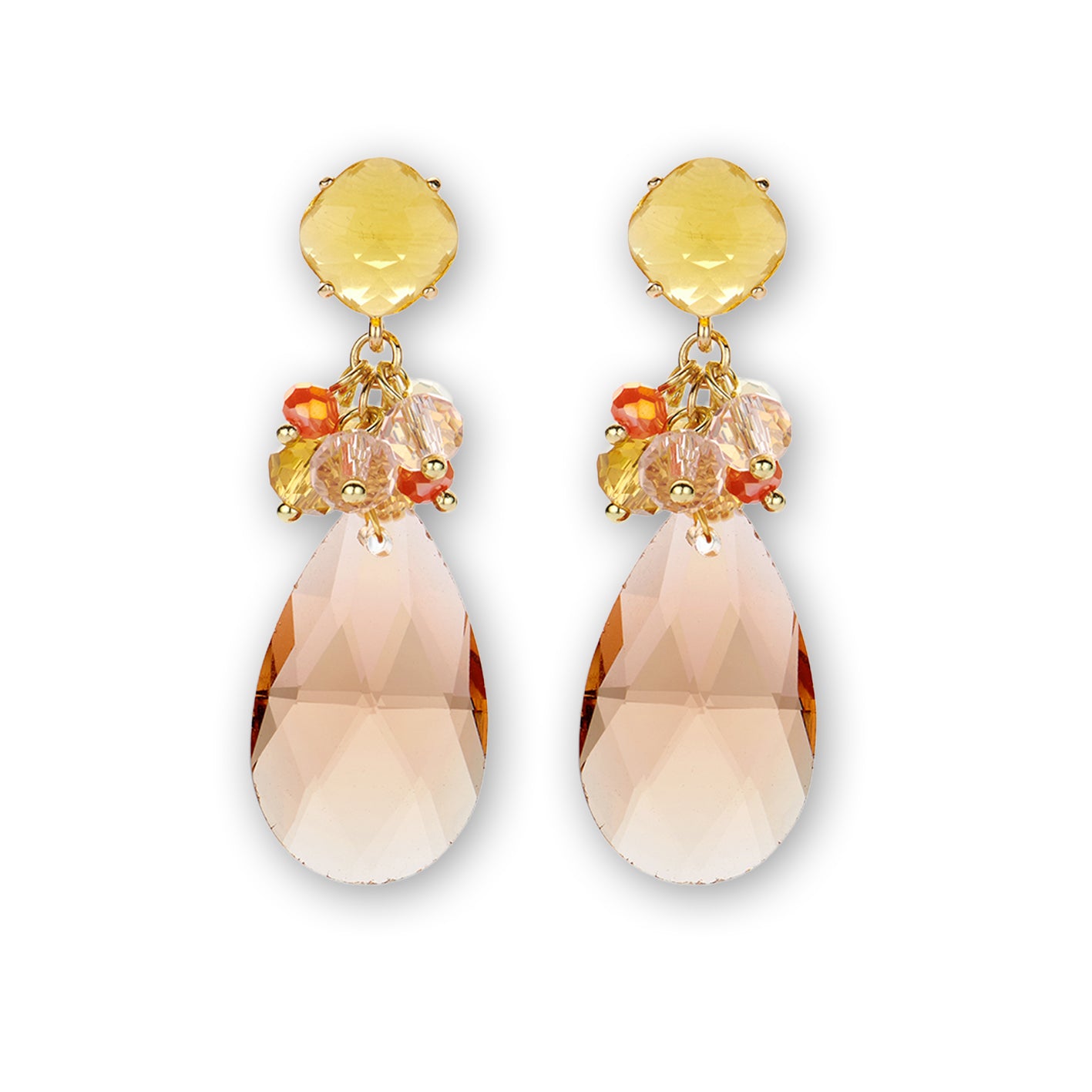 Die edlen rosè farbenen Tropfsteine mit goldener Fassung und der goldenen kleinen Perlen am Ohr verleihen Ihrem Style ein luxuriöses Flair. Kombinieren Sie diese Ohrringe mit edlen Natur und rosé Tönen oder weiß und setzten sie ein Statement.
