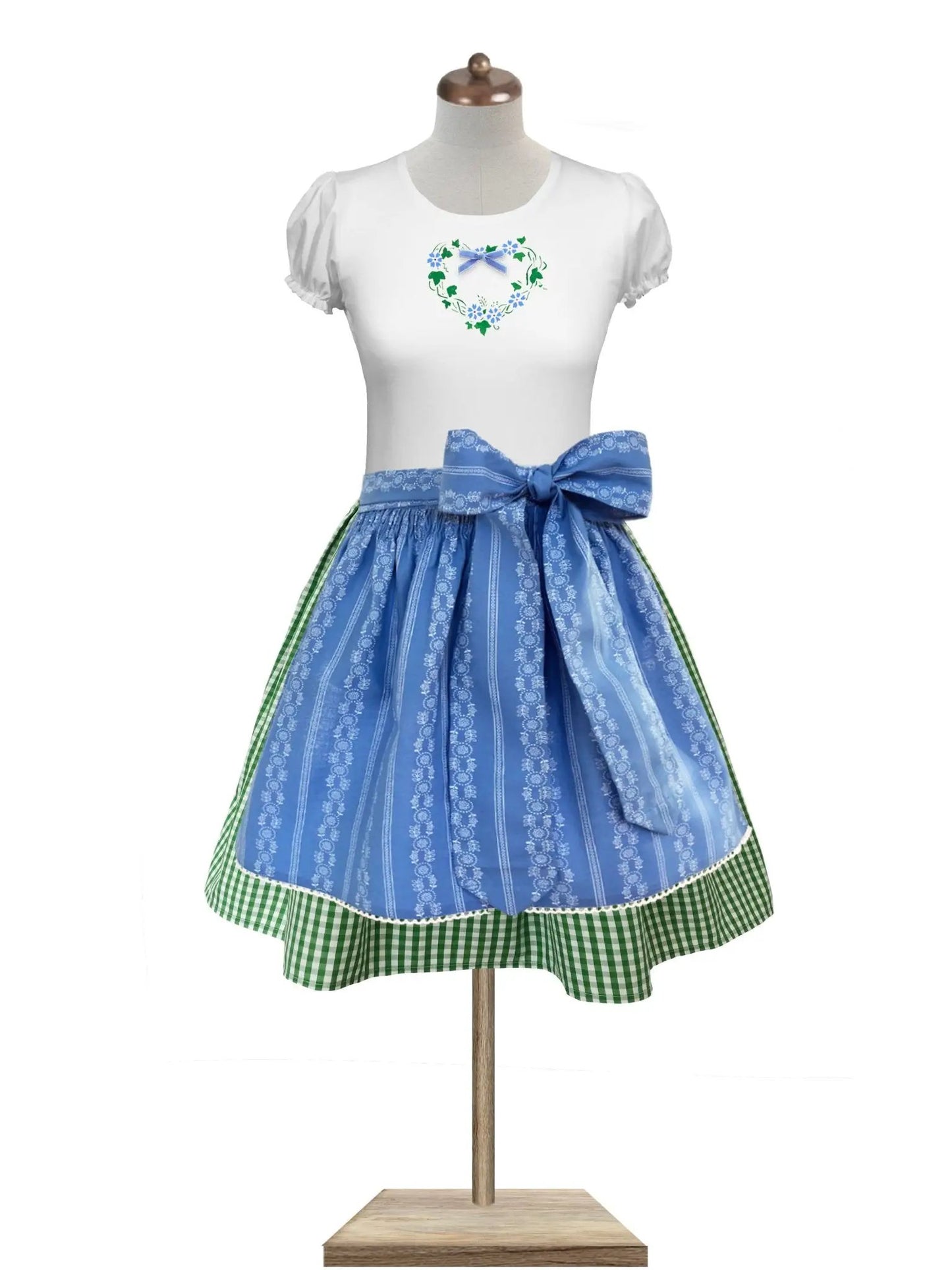 Der grüne karierte Rock wird kombiniert mit einer himmelblauen Schürze und Ranken und einem Dirndlshirt mit Trachtenmotiv. Das Shirtmotiv ist ein zartes Herz aus kleinen Samt Blüten und Blättern sowie einer Samtschleifen. Die aufwendigen Motive werden alle von Hand in Bayern gearbeitet. Und falls es mal nicht so schick sein soll, dann lässt man die Schürze weg und trägt den Rock einfach solo mit dem Shirt. Ergänzen sie ihr Dirndl mit einem zweiten Shirt, dann hat man die Möglichkeit zu wechseln falls das Lieblingsshirt mal in die Wäsche muss.